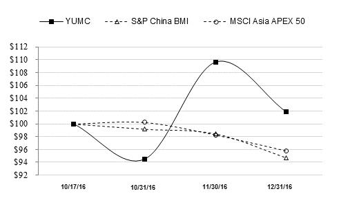 The Company separated from Yum! Brands, Inc. (“YUM” or the “Parent”) on October 31, 2016 (the “separation”), becoming an independent, publicly traded company as a result of a pro rata distribution (the “distribution”) of all outstanding shares of Yum China common stock to shareholders of YUM. On October 31, 2016, YUM’s shareholders of record as of 5:00 p.m. Eastern Time on October 19, 2016 received one share of Yum China common stock for every one share of YUM common stock held as of the record date. Yum China’s common stock began trading “regular way” under the ticker symbol “YUMC” on the New York Stock Exchange on November 1, 2016.