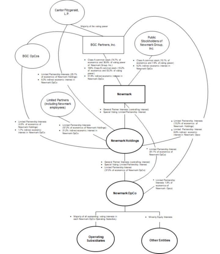 The following diagram illustrates our ownership structure as of June 30, 2018. The diagram does not reflect the various subsidiaries of Newmark, Newmark Holdings, Newmark OpCo, BGC Partners, BGC U.S. OpCo, BGC Global OpCo or Cantor, the results of any exchange of Newmark Holdings exchangeable limited partnership interests or, to the extent applicable, Newmark Holdings founding partner interests, Newmark Holdings working partner interests or Newmark Holdings limited partnership units. In addition, the diagram does not reflect the EPUs in Newmark OpCo held by RBC. Holders of the EPUs are not allocated any gains or losses for tax purposes and are not entitled to regular distributions. For additional information regarding the EPUs, please see the section titled “Exchangeable Preferred Partnership Units and Forward Contract” in Note 1 – Organization and Basis of Presentation and the section titled “Exchangeable preferred Limited Partnership Units” in Note 2 – Limited Partnership Interests in our unaudited condensed consolidated financial statements in Part I, Item 1 of this Quarterly Report on Form 10-Q.