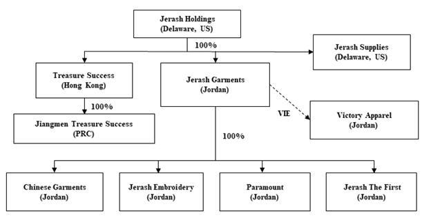 Jerash Holdings is a holding company organized in Delaware in January 2016. As of the date of this annual report, Jerash Holdings has the following wholly owned subsidiaries: (i) Jerash Garments and Fashions Manufacturing Co., Ltd. (“Jerash Garments”), an entity formed under the laws of Jordan, (ii) Treasure Success International Limited (“Treasure Success”), an entity formed under the laws of Hong Kong Special Administrative Region of the People’s Republic of China (“Hong Kong” or “HK”), (iii) Chinese Garments and Fashions Manufacturing Co., Ltd. (“Chinese Garments”), an entity formed under the laws of Jordan and a wholly owned subsidiary of Jerash Garments, (iv) Jerash for Industrial Embroidery Co., Ltd. (“Jerash Embroidery”), an entity formed under the laws of Jordan and a wholly owned subsidiary of Jerash Garments, (v) Al-Mutafaweq Co. for Garments Manufacturing Ltd. (“Paramount”), an entity formed under the laws of Jordan and a wholly owned subsidiary of Jerash Garments, (vi) Jiangmen Treasure Success Business Consultancy Co., Ltd. (“Jiangmen Treasure Success”), an entity incorporated under the laws of the People’s Republic of China (“China” or the “PRC”) and a wholly owned subsidiary of Treasure Success, (vii) Jerash The First Medical Supplies Manufacturing Company Limited (“Jerash The First”), an entity formed under the laws of Jordan and a wholly owned subsidiary of Jerash Garments, and (viii) Jerash Supplies, LLC (“Jerash Supplies”), an entity formed under the laws of the State of Delaware.