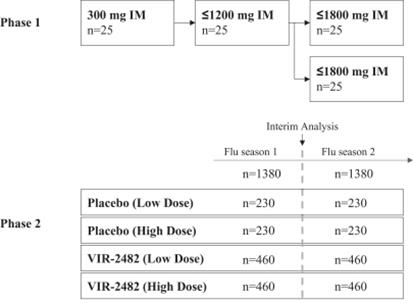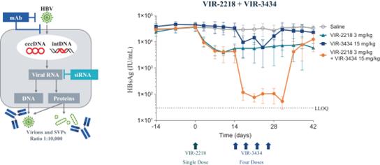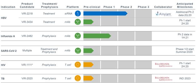 We have assembled four technology platforms, focused on antibodies, T cells, innate immunity and small interfering ribonucleic acid, or siRNA, through internal development, collaborations and acquisitions. Our current development pipeline consists of product candidates targeting hepatitis B virus, or HBV, influenza A, severe acute respiratory syndrome coronavirus 2, or SARS-CoV-2, human immunodeficiency virus, or HIV, and tuberculosis, or TB. VIR-2218, an HBV-targeting siRNA, has completed enrollment in an ongoing Phase 1/2 clinical trial. Initial data have demonstrated substantial reduction of hepatitis B virus surface antigen, or HBsAg, and VIR-2218 has been generally well-tolerated. We are next planning a Phase 2 trial combining VIR-2218 with pegylated interferon-alpha, or PEG-IFN-α, an approved immune modulatory agent. Additionally, we have initiated a Phase 1/2 clinical trial for VIR-2482, a monoclonal antibody, or mAb, designed for the prevention of influenza A. We have built an industry-leading team that has deep experience in immunology, infectious diseases and product development. Given the global impact of infectious diseases, we are committed to developing cost-effective treatments that can be delivered at scale.