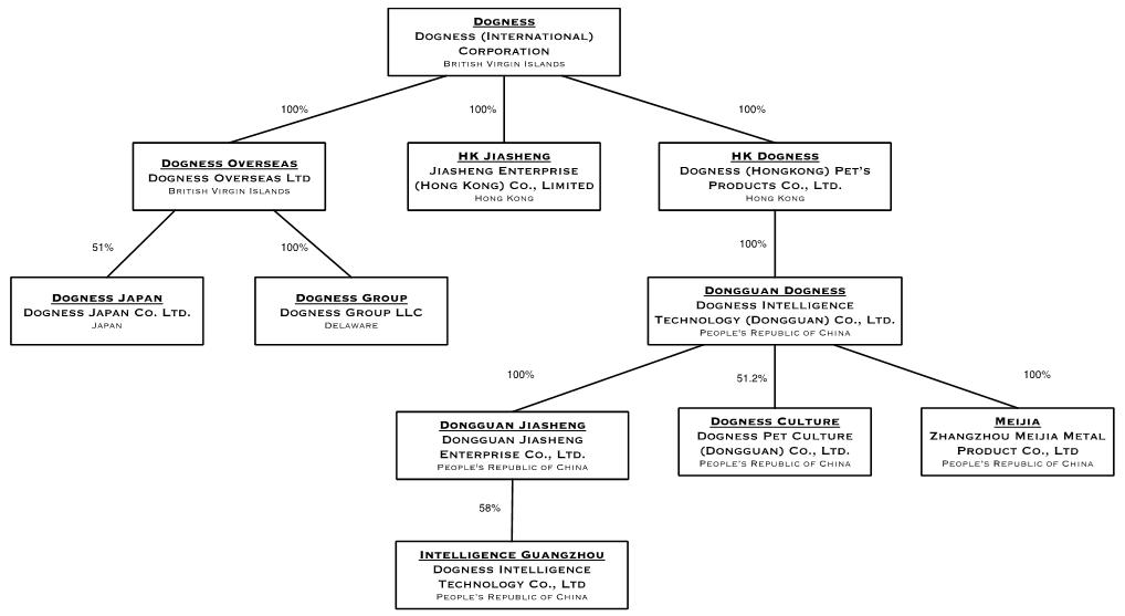 Dogness was established under the laws of BVI on July 11, 2016. The original authorized number of common shares was 15,000,000 shares with par value of $0.002 each. On April 26, 2017, Shareholders of the Company held a meeting (the “Meeting”) and approved the following resolutions: (i) increase the authorized number of common shares to 100,000,000 shares with par value of $0.002 each, of which 15,000,000 were issued and outstanding; and (ii) reclassify the currently issued and outstanding common shares into two classes, Class A common shares and Class B common shares, which have equal economic rights but unequal voting rights, pursuant to which Class A common shares receive one vote each and Class B common shares receive three votes each. The Meeting approved to reclassify all the shares beneficially owned by Mr. Silong Chen as Class B common shares and all other shares owned by the other shareholders as Class A common shares. As a result, Mr. Silong Chen owns 9,069,000 Class B common shares of par value of $0.002. The rest of the Company’s shareholders as of the date of the meeting owned an aggregated of 5,931,000 Class A common shares of par value of $0.002 each.