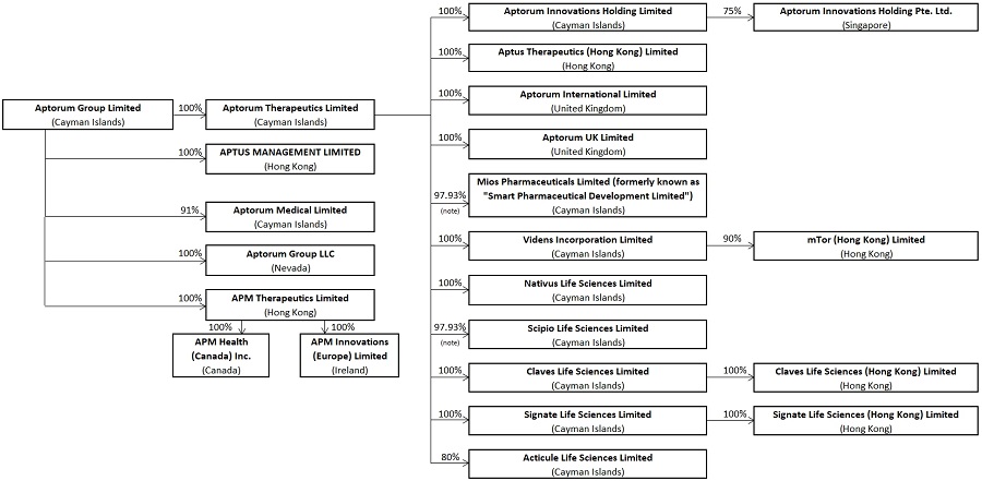 | ● | “Aptorum Therapeutics Group” refers to the Company’s therapeutics segment that is operated through its wholly-owned subsidiary, Aptorum Therapeutics Limited, a Cayman Islands exempted company with limited liability, whose principal place of business is in Hong Kong and its indirect subsidiary companies, whose principal places of business are in the United Kingdom, Singapore and Hong Kong. | |