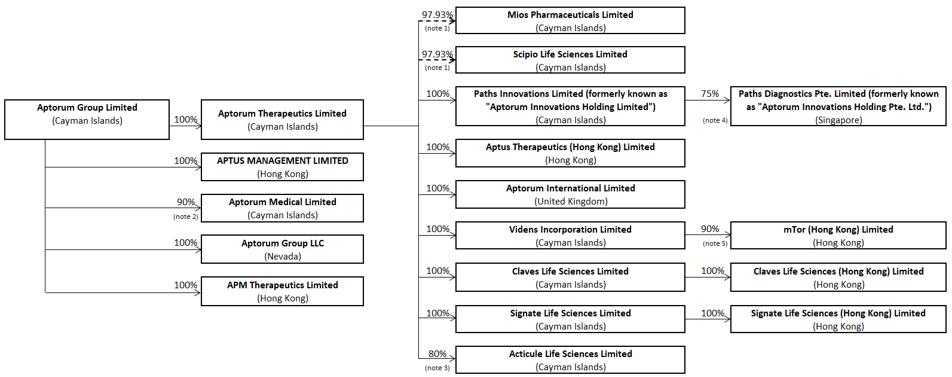 “Aptorum Therapeutics Group” refers to the Company’s therapeutics segment that is operated through its wholly-owned subsidiary, Aptorum Therapeutics Limited, a Cayman Islands exempted company with limited liability, whose principal place of business is in Hong Kong and its indirect subsidiary companies, whose principal places of business are in the United Kingdom, Singapore and Hong Kong.