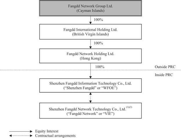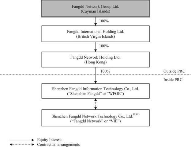 | ● | “we,” “us,” “our company,” “our” and “Fangdd Cayman” refer to Fangdd Network Group Ltd., a Cayman Islands exempted company, and its subsidiaries and, only in the context of describing our operations and consolidated financial information, also include the consolidated VIE and its subsidiaries, which are domestic PRC companies that conduct business operations in China in which we do not have any equity ownership but whose financial results have been consolidated into our consolidated financial statements based solely on contractual arrangements in accordance with U.S. GAAP. |