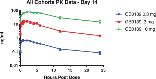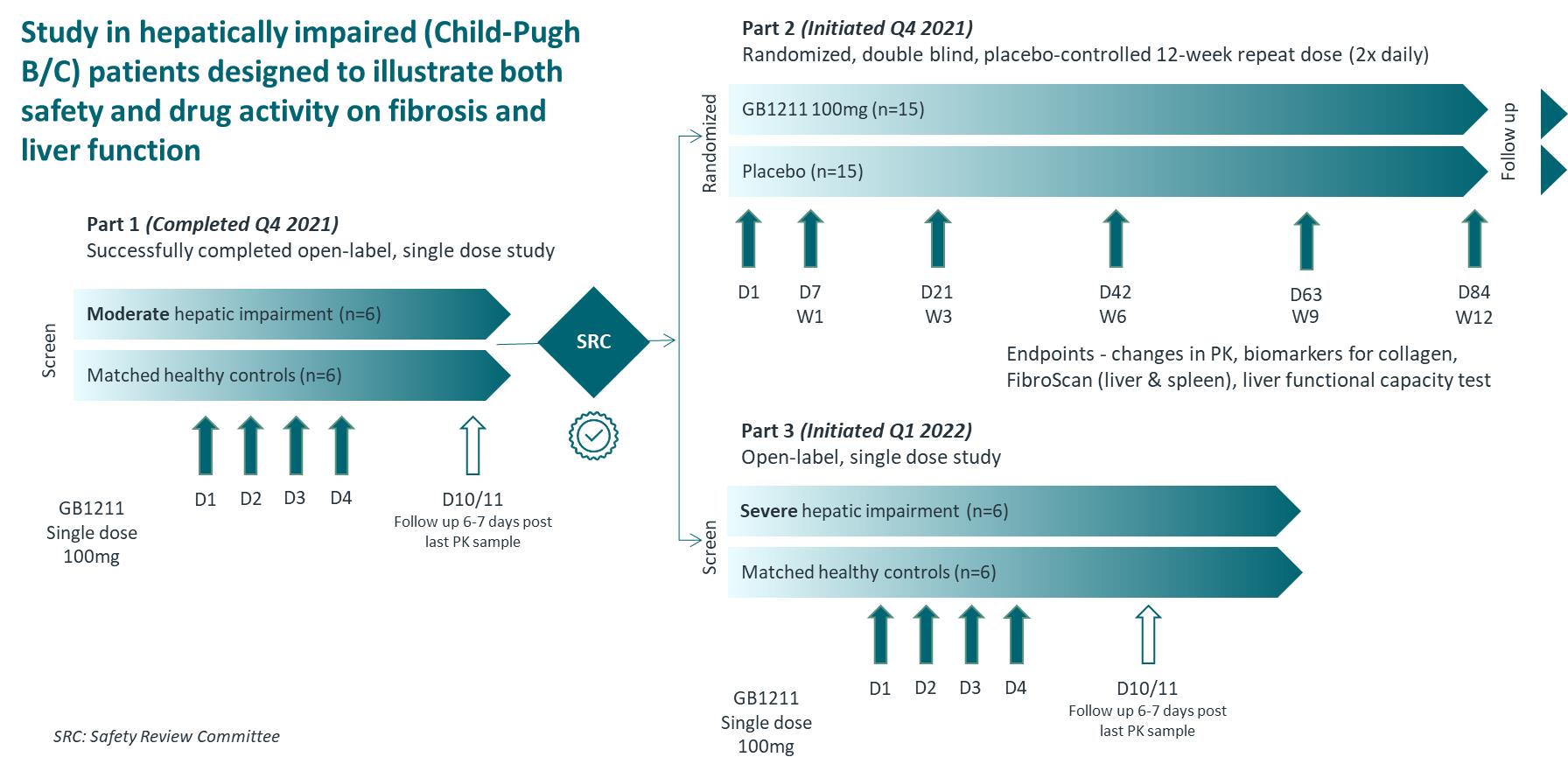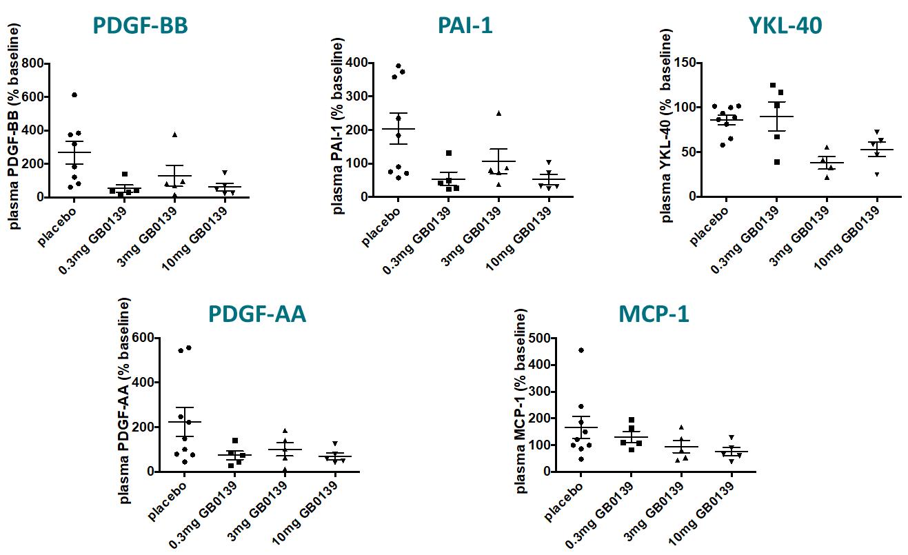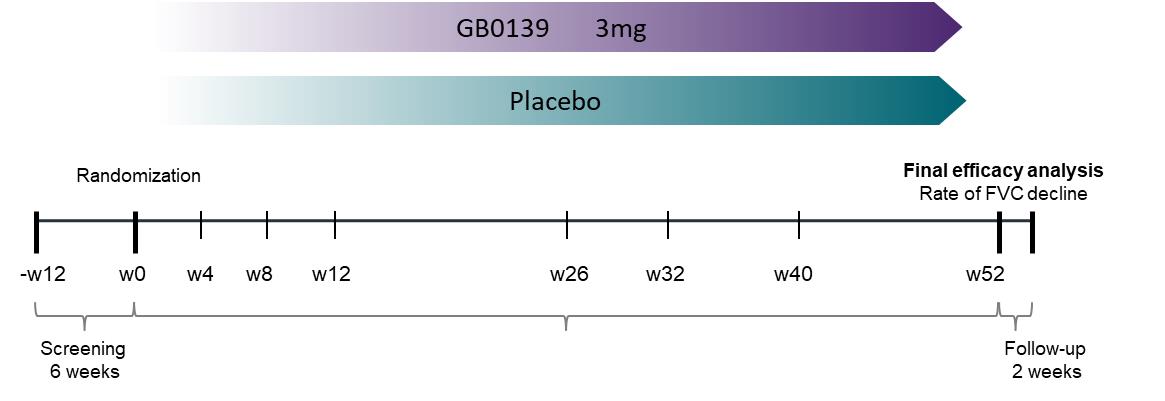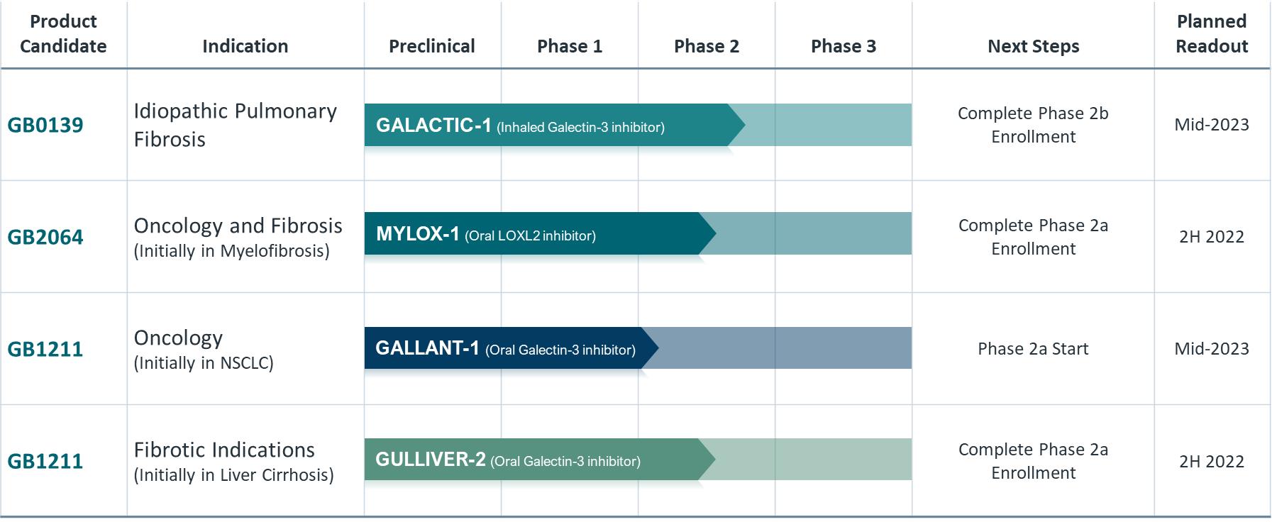 Our most advanced product candidate, GB0139, is an inhaled small molecule inhibitor of galectin-3, one of the key regulators of fibrosis that controls the pro-fibrotic activity of TGF-b. Overexpression of galectin-3 is ubiquitous in fibrotic tissue, including in fibrotic lung tissue, and is linked to both disease severity and disease progression, as well as acute exacerbations of IPF. We are initially developing GB0139 for the treatment of idiopathic pulmonary fibrosis, or IPF, a life-threatening progressive fibrotic disease of the lung. IPF affects approximately 100,000 people in the United States, but limited treatment options have been associated with significant side effects, leading to poor therapeutic adherence. In our clinical trials completed to date, we found orally inhaled GB0139 to be generally well-tolerated and it inhibited galectin-3 in the lungs in a dose-dependent manner. We also observed that GB0139 decreased levels of a range of plasma biomarkers, such as YKL-40 and platelet-derived growth factor, or PDGF, that have been linked to mortality, disease severity and/or progression in IPF. We are currently conducting a 52-week randomized, double-blind, multicenter, parallel, placebo-controlled Phase 2b trial investigating the safety and efficacy of GB0139 in patients with IPF, which we refer to as the GALACTIC-1 trial. We expect to complete enrollment in the second quarter of 2022 and topline results to be available in mid-2023.
