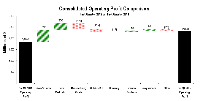 Caterpillar's actual results may differ materially from those described or implied in our forward-looking statements based on a number of factors, including, but not limited to: (i) global economic conditions and economic conditions in the industries and markets we serve; (ii) government monetary or fiscal policies and infrastructure spending; (iii) commodity or component price increases and/or limited availability of raw materials and component products, including steel; (iv) our and our customers', dealers' and suppliers' ability to access and manage liquidity; (v) political and economic risks and instability, including national or international conflicts and civil unrest; (vi) our and Cat Financial's ability to: maintain credit ratings, avoid material increases in borrowing costs, and access capital markets; (vii) the financial condition and credit worthiness of Cat Financial's customers; (viii) inability to realize expected benefits from acquisitions and divestitures, including the acquisition of Bucyrus International, Inc.; (ix) international trade and investment policies; (x) challenges related to Tier 4 emissions compliance; (xi) market acceptance of our products and services; (xii) changes in the competitive environment, including market share, pricing and geographic and product mix of sales; (xiii) successful implementation of capacity expansion projects, cost reduction initiatives and efficiency or productivity initiatives, including the Caterpillar Production System; (xiv) sourcing practices of our dealers or original equipment manufacturers; (xv) compliance with environmental laws and regulations; (xvi) alleged or actual violations of trade or anti-corruption laws and regulations; (xvii) additional tax expense or exposure; (xviii) currency fluctuations; (xix) our or Cat Financial's compliance with financial covenants; (xx) increased pension plan funding obligations; (xxi) union disputes or other employee relations issues; (xxii) significant legal proceedings, claims, lawsuits or investigations; (xxiii) compliance requirements imposed if carbon emissions legislation and/or regulations are adopted; (xxiv) changes in accounting standards; (xxv) failure or breach of IT security; (xxvi) adverse effects of natural disasters; and (xxvii) other factors described in more detail under “Item 1A. Risk Factors” in our Form 10-K filed with the SEC on February 21, 2012 for the year ended December 31, 2011. This filing is available on our website at www.caterpillar.com/secfilings.