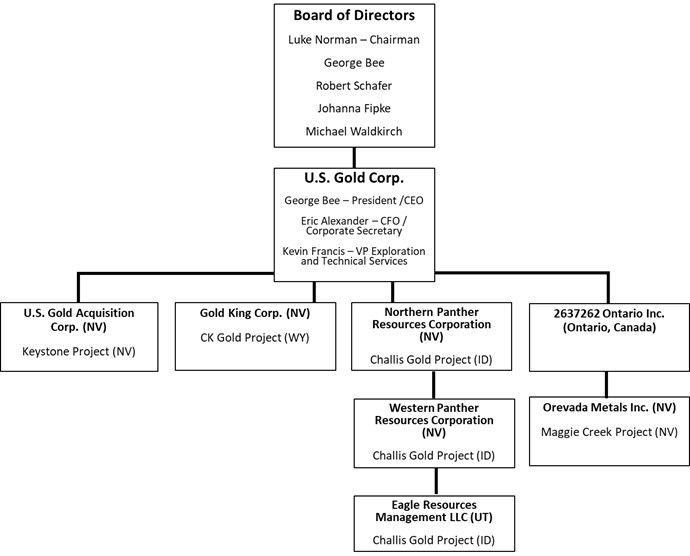 U.S. Gold Corp., formerly known as Dataram Corporation (the “Company,” “we,” “our,” or “us”), was re-incorporated under the laws of the State of Nevada in 2016 and was originally incorporated in the State of New Jersey in 1967. Effective June 26, 2017, the Company changed its legal name to U.S. Gold Corp. from Dataram Corporation. On May 23, 2017, the Company merged with Gold King Corp. (“Gold King”), in a transaction treated as a reverse acquisition and recapitalization, and the business of Gold King became the business of the Company. We are a gold, copper and precious metals development and exploration company pursuing exploration opportunities primarily in Wyoming, Nevada and Idaho.