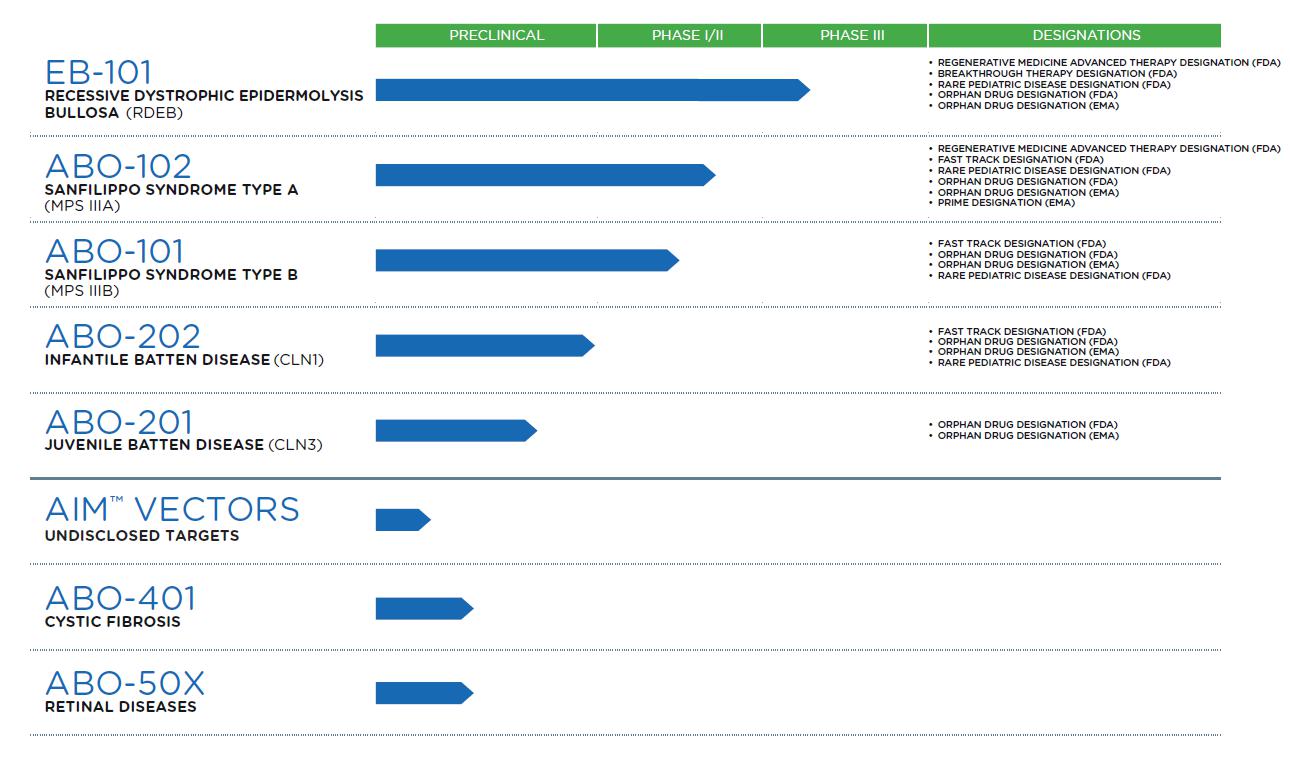Forward-looking statements necessarily involve risks and uncertainties, and our actual results could differ materially from those anticipated in forward-looking statements due to a number of factors. These statements include statements about: the potential impacts of the COVID-19 pandemic on our business, operations, and financial condition; the achievement of or expected timing, progress and results of clinical development, clinical trials and potential regulatory approvals; our Phase III clinical trial (VIITAL™) for patients with recessive dystrophic epidermolysis bullosa (“RDEB”) and our beliefs relating thereto; our ability to identify and enroll patients in the Phase III clinical trial; our pipeline of product candidates; our belief that we have sufficient resources to fund operations for the next 12 months; the dilutive effect that raising additional funds by selling additional equity securities would have on the relative equity ownership of our existing investors; our belief that EB-101 could potentially benefit patients with RDEB; our belief that adeno-associated virus (“AAV”) treatment could potentially benefit patients with Sanfilippo syndrome type A (“MPS IIIA”) and Sanfilippo syndrome type B (“MPS IIIB”); our ability to develop our novel AAV-based gene therapy platform technology; our belief in the adequacy of the data from clinical trials, including trials in EB-101 and our Phase I/II clinical trial in ABO-102 (AAV-SGSH) for MPS IIIA, together with the data generated in the program to date, to support regulatory approvals; our dependence upon our third-party and related-party customers and vendors and their compliance with regulatory bodies; our intellectual property position and our ability to obtain, maintain and enforce intellectual property protection and exclusivity for our proprietary assets; our estimates regarding the size of the potential markets for our product candidates, the strength of our commercialization strategies and our ability to serve and supply those markets; and future economic conditions or performance.