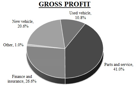 We offer a diversified range of automotive products and services, including new vehicles, used vehicles, “parts and service,” which includes automotive repair and maintenance services as well as wholesale parts and collision businesses, and automotive “finance and insurance” products, which include vehicle service and other protection products, as well as the arranging of financing for vehicle purchases through third-party finance sources. The following charts present the contribution to total revenue and gross profit by each of new vehicle sales, used vehicle sales, parts and service, and finance and insurance in 2015.