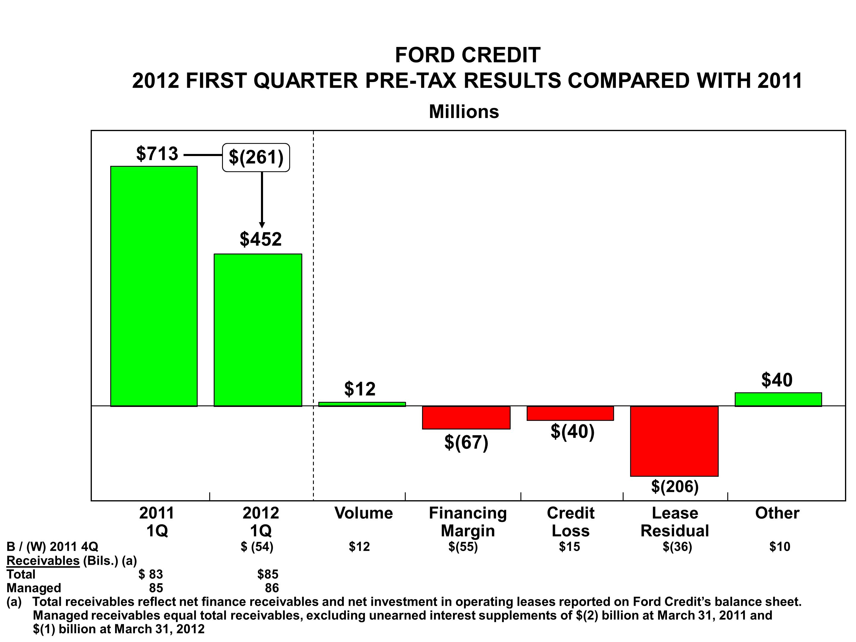 Interest Rate Risk. To provide a quantitative measure of the sensitivity of Ford Credit's pre-tax cash flow to changes in interest rates, Ford Credit uses interest rate scenarios that assume a hypothetical, instantaneous increase or decrease of one percentage point in all interest rates across all maturities (a "parallel shift"), as well as a base case that assumes that all interest rates remain constant at existing levels. These interest rate scenarios are purely hypothetical and do not represent Ford Credit's view of future interest rate movements. The differences in pre-tax cash flow between these scenarios and the base case over a twelve-month period represent an estimate of the sensitivity of Ford Credit's pre-tax cash flow. Under this model, Ford Credit estimates that at March 31, 2012, all else constant, such an increase in interest rates would increase pre-tax cash flow by $78 million over the next twelve months, compared with an increase of $60 million at December 31, 2011. The sensitivity analysis presented above assumes a one-percentage point interest rate change to the yield curve that is both instantaneous and parallel. In reality, interest rate changes are rarely instantaneous or parallel and rates could move more or less than the one percentage point assumed in Ford Credit's analysis. As a result, the actual impact to pre-tax cash flow could be higher or lower than the results detailed above.