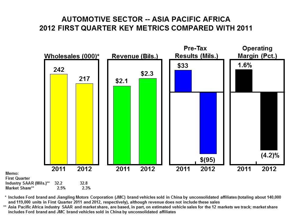 Canadian Export Antitrust Class Actions (as previously reported on page 26 of our 2011 Form 10-K Report). As previously disclosed, eighty-three purported class actions have been filed in various state and federal courts against numerous defendants, including Ford, on behalf of all purchasers of new motor vehicles in the United States since January 1, 2001. The complaints allege, among other things, that vehicle manufacturers, aided by dealer associations, conspired to prevent the sale to U.S. citizens of vehicles produced for the Canadian market and sold by dealers in Canada at lower prices than vehicles sold in the United States. The complaints seek injunctive relief under federal antitrust law and treble damages under federal and state antitrust laws. The federal actions were consolidated for coordinated pretrial proceedings in the U.S. District Court for the District of Maine and have been dismissed. Cases remain pending in state courts in Florida, New Mexico, Tennessee, and Wisconsin. In California, where a statewide class had been certified, the court granted our motion for summary judgment; plaintiffs have now filed an appeal of the dismissal.