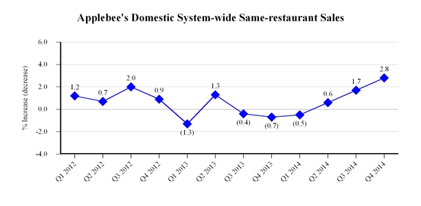 We franchise, own and operate Applebee’s restaurants in the bar and grill segment within the casual dining category of the restaurant industry. Each Applebee's restaurant is designed as an attractive, friendly establishment featuring high quality, moderately-priced food, alcoholic and non-alcoholic beverage items, table service and a comfortable neighborhood atmosphere. Applebee’s features a selection of modern American grill and bar fare, such as appetizers, sandwiches and burgers, classic entrees and grilled steaks, specialty cocktails, beers and desserts. Our signature value menu “2 for $20,” first introduced in 2009, sets the standard within the industry and continues to resonate with our guests. Our commitment to industry leading innovation is evident behind such product platforms as “Unbelievably Great Tasting & Under 550 Calories,” our famous “All-In Burgers,” and most recently, the introduction of “The Pub Diet - grill and bar classics made a little better for you.” Each of our platforms is refreshed regularly to ensure that we are meeting the ever changing tastes and preferences of our guests so that they will choose to make Applebee’s their place, every day.