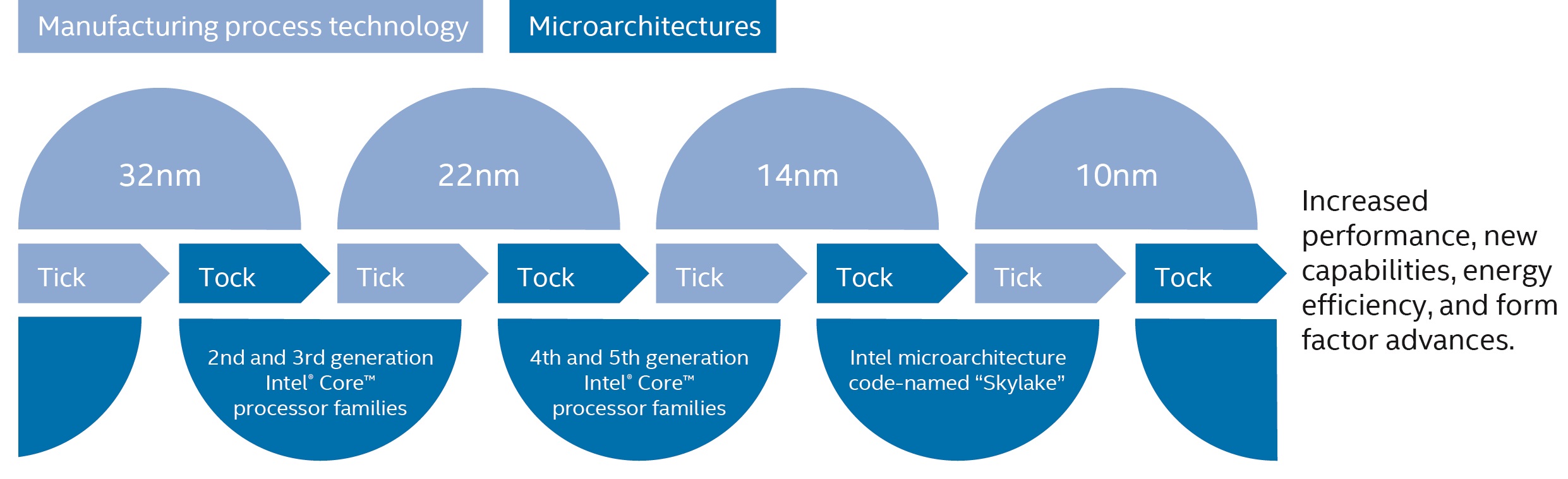 Silicon and Manufacturing Technology Leadership. We have long been a leader in silicon process technology and manufacturing, and we aim to continue our lead through investment and innovation in this critical area. Moore's Law predicted that transistor density on integrated circuits would double about every two years. We continue executing to Moore’s Law by enabling new devices with higher functionality and complexity while controlling power, cost, and size. In keeping with Moore's Law, we drive a regular and predictable upgrade cycle—introducing a new microarchitecture approximately every two to three years and ramping the next generation of silicon process technology in the intervening periods. We refer to this as our "tick-tock" technology development cadence. Through this cycle, we continue to push progress by designing and putting transistor innovations into high-volume production. We aim to have the best process technology, and unlike many semiconductor companies, we primarily manufacture our products in our own facilities. This in-house manufacturing capability enables us to optimize performance, shorten our time to market, and scale new products more rapidly. We believe this competitive advantage will be extended in the future as the costs to build leading-edge fabrication facilities increase, and as fewer semiconductor companies will be able to combine platform design and manufacturing.