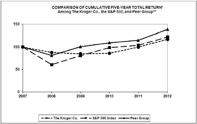 The aggregate market value of the Common Stock of The Kroger Co. held by non-affiliates as of August 11, 2012:  $12.0 billion.  There were 520,863,025 shares of Common Stock ($1 par value) outstanding as of March 29, 2013.