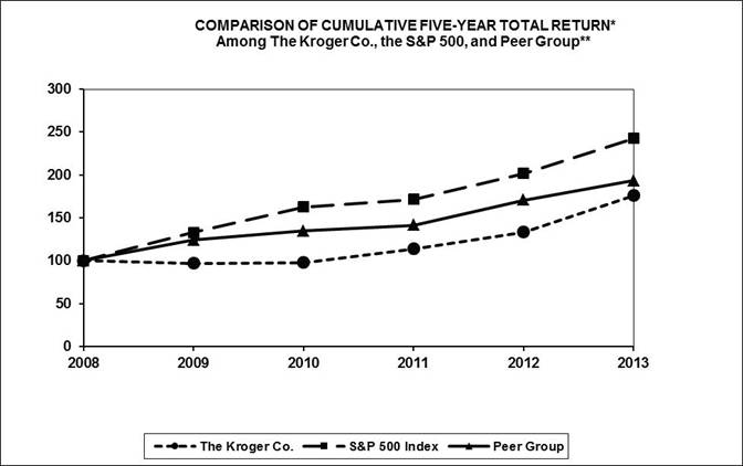 The aggregate market value of the Common Stock of The Kroger Co. held by non-affiliates as of August 17, 2013:  $19.8 billion.  There were 510,765,637 shares of Common Stock ($1 par value) outstanding as of March 28, 2014.
