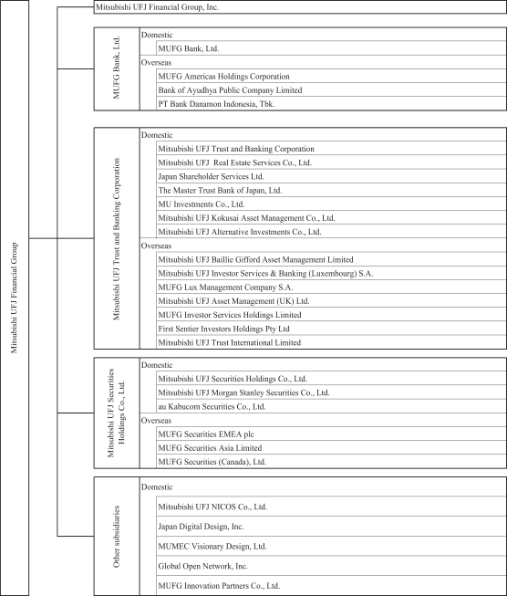 When we refer in this Annual Report to “MUFG,” “we,” “us,” “our” and the “Group,” we generally mean Mitsubishi UFJ Financial Group, Inc. and its consolidated subsidiaries, but from time to time as the context requires, we mean Mitsubishi UFJ Financial Group, Inc. as an individual legal entity. In addition, our “commercial banking subsidiaries” refers to MUFG Bank, Ltd. and, as the context requires, its consolidated subsidiaries engaged in the commercial banking business. Our “trust banking subsidiaries” refers to Mitsubishi UFJ Trust and Banking Corporation and, as the context requires, its consolidated subsidiaries engaged in the trust banking business. Our “banking subsidiaries” refers to MUFG Bank and Mitsubishi UFJ Trust and Banking and, as the context requires, their respective consolidated subsidiaries engaged in the banking business. Our “securities subsidiaries” refers to Mitsubishi UFJ Securities Holdings Co., Ltd., and as the context requires, its consolidated subsidiaries engaged in the securities business.