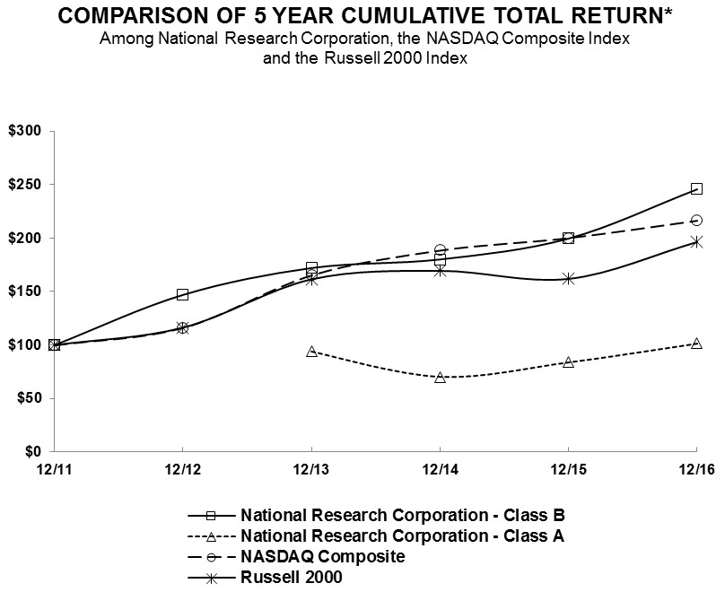 Financial statements from the Annual Report on Form 10-K of National Research Corporation for the year ended December 31, 2016, formatted in eXtensible Business Reporting Language (XBRL): (i) the Consolidated Balance Sheets, (ii) the Consolidated Statements of Income, (iii) Consolidated Statements of Comprehensive Income, (iv) Consolidated Statements of Shareholders’ Equity, (v) the Consolidated Statements of Cash Flows, (vi) the Notes to the Consolidated Financial Statements, and (vii) document and entity information.