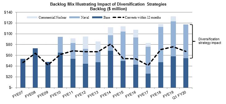 Backlog was $117,185 at June 30, 2019, compared with $132,127 at March 31, 2019, an 11% decrease.  The decrease includes $9,777 of backlog for our commercial nuclear business which we sold in June 2019.  Backlog is defined as the total dollar value of orders received for which revenue has not yet been recognized.  Approximately 55% to 60% of orders currently in our backlog are expected to be converted to sales within one year.  The majority of the orders that are expected to convert beyond twelve months are for the U.S. Navy.  At June 30, 2019, 21% of our backlog was attributable to equipment for refinery project work, 21% for chemical and petrochemical projects, 54% for U.S. Navy projects and 4% for power and other industrial applications.  This split of backlog by end market is comparable to the levels on March 31, 2019.  At June 30, 2018, 22% of our backlog was attributable to equipment for refinery project work, 11% for chemical and petrochemical projects, 56% for U.S. Navy projects and 11% for power and other industrial applications.  At June 30, 2019, we had no projects on hold.