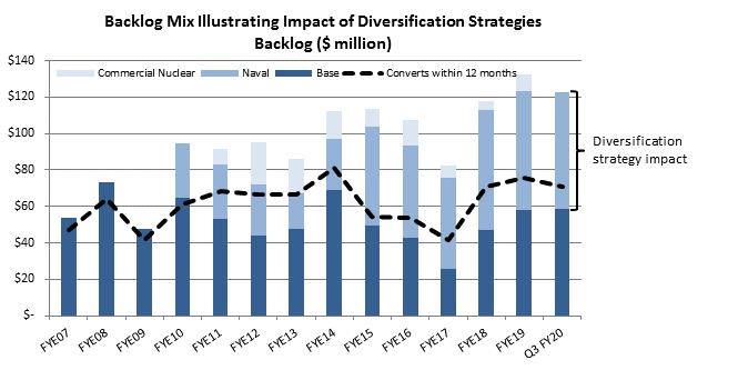 Backlog was $122,899 at December 31, 2019, compared with $127,765 on September 30, 2019, down 4% and $132,127 at March 31, 2019.  The March 31, 2019 backlog includes $8,039 of backlog for our subsidiary which serviced the commercial nuclear industry which we sold in June 2019.  Backlog is defined as the total dollar value of orders received for which revenue has not yet been recognized.  Approximately 55% to 60% of orders currently in our backlog are expected to be converted to sales within one year.  The majority of the orders that are expected to convert beyond twelve months are for the U.S. Navy.  At December 31, 2019, 30% of our backlog was attributable to equipment for refinery project work, 13% for chemical and petrochemical projects, 52% for U.S. Navy projects and 5% for power and other industrial applications.  At December 31, 2018, 23% of our backlog was attributable to equipment for refinery project work, 20% for chemical and petrochemical projects, 50% for U.S. Navy projects and 7% for power and other industrial applications.  At December 31, 2019, we had no projects on hold.