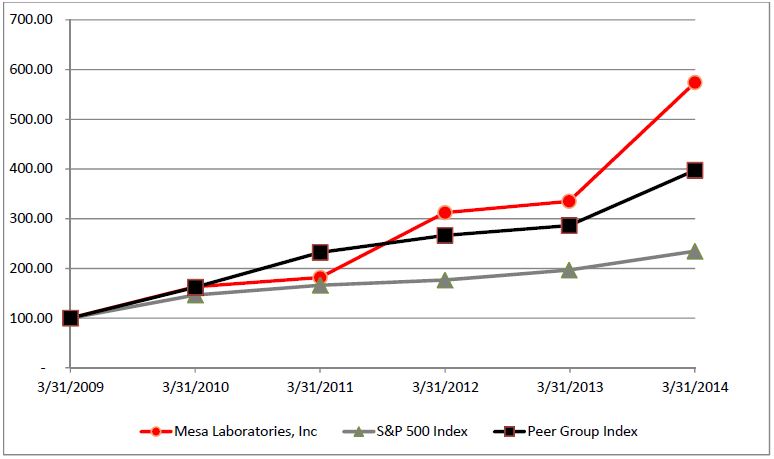 The aggregate market value as of September 30, 2013 (the last business day of the registrant's most recently completed second fiscal quarter), of the voting and non-voting common equity of Mesa Laboratories Inc. held by non-affiliates (assuming, for this purpose, that all directors, officers and owners of 5% or more of the registrant’s common stock are deemed affiliates) computed by reference to the price at which the common equity was last sold ($67.36 per share) was $164,839,000.