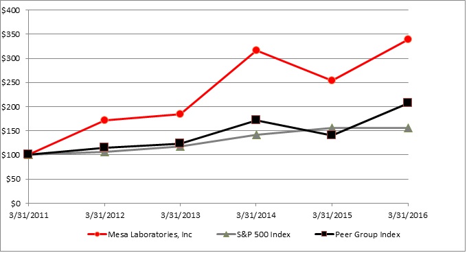 The aggregate market value as of September 30, 2015 (the last business day of the registrant's most recently completed second fiscal quarter), of the voting and non-voting common equity of Mesa Laboratories Inc. held by non-affiliates (assuming, for this purpose, that all directors, officers and owners of 5% or more of the registrant’s common stock are deemed affiliates) computed by reference to the price at which the common equity was last sold ($111.04 per share) was $240,104,000.