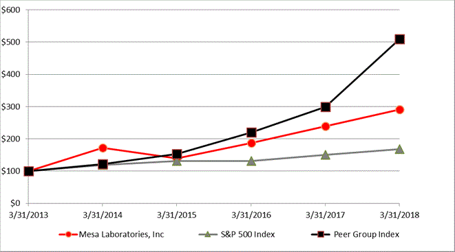 The aggregate market value as of September 30, 2017 (the last business day of the registrant's most recently completed second fiscal quarter), of the voting and non-voting common equity of Mesa Laboratories Inc. held by non-affiliates (assuming, for this purpose, that all directors, officers and owners of 5% or more of the registrant’s common stock are deemed affiliates) computed by reference to the price at which the common equity was last sold ($149.32 per share) was $384,259,000.