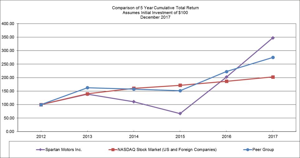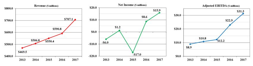 In 2015 we began executing against an aggressive turnaround plan targeting a return to profitability within three years. 2017 marks the end of that turnaround phase with our ER business returning to profitability and the beginning of our growth phase. We will continue to work towards maximizing operational efficiency and profitability, and add in a new focus on growing our revenue and market share through a combination of organic growth, acquisitions and entry into new synergistic markets. As illustrated in the charts below, over the past five years our revenue has increased by $237.6 million, a compound annual growth rate (CAGR) of 10.8%, while net income and adjusted EBITDA have grown by $21.9 million and $22.4 million respectively.  Please see the reconciliation of adjusted EBITDA to Net income attributable to Spartan Motors, Inc., below.