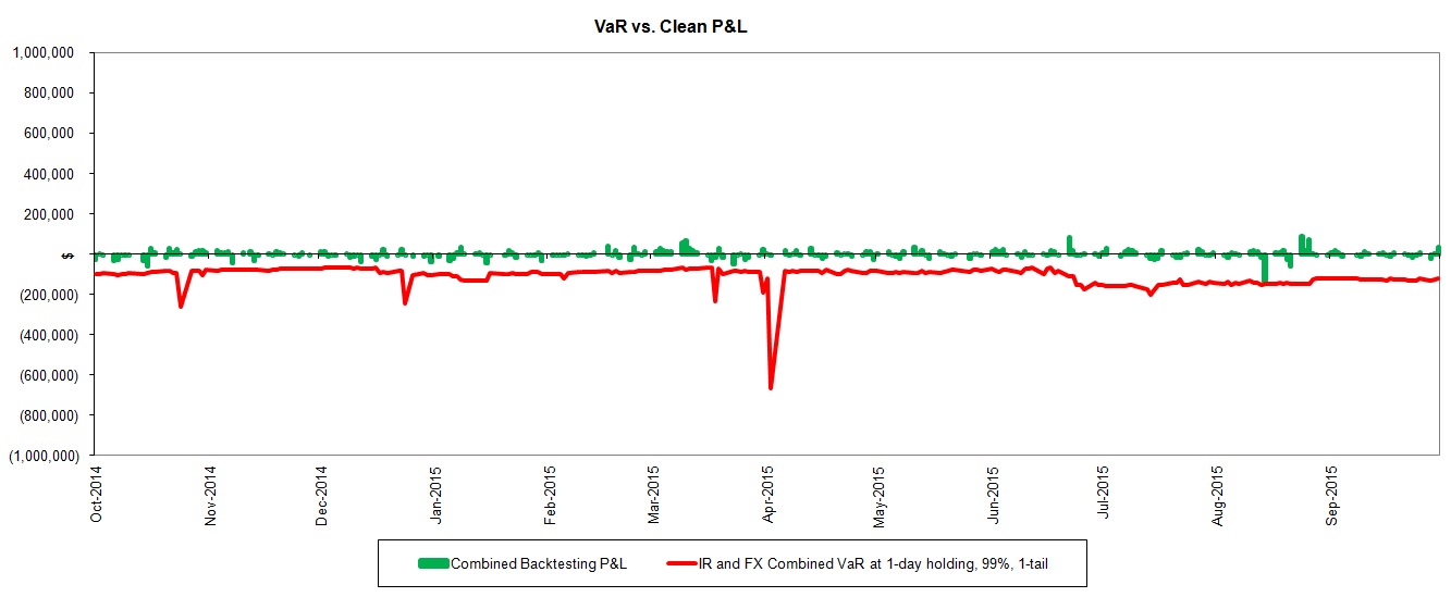 Backtesting is one form of validation of the VaR model. The Market Risk Rule requires a comparison of our internal VaR measure to the actual net trading revenue (excluding fees, commissions, reserves, intra-day trading and net interest income) for each day over the preceding year (the most recent 250 business days). Any observed loss in excess of the VaR number is taken as an exception. The level of exceptions determines the multiplication factor used to derive the VaR and SVaR-based capital requirement for regulatory reporting purposes. We perform sub-portfolio backtesting as required under the Market Risk Rule, and as approved by our banking regulators, for interest rate and foreign exchange positions. The following table shows our daily net trading revenue and total internal, modeled VaR for the quarters ending September 30, 2015, March 31, 2015, December 31, 2014, and September 30, 2014. As of this reporting quarter we use a multiplication factor derived from our specific backtesting results and no longer that of RBS, as agreed with our banking regulators. This capital multiplier change resulted in a non-meaningful reduction of market risk capital on a pro-forma basis.