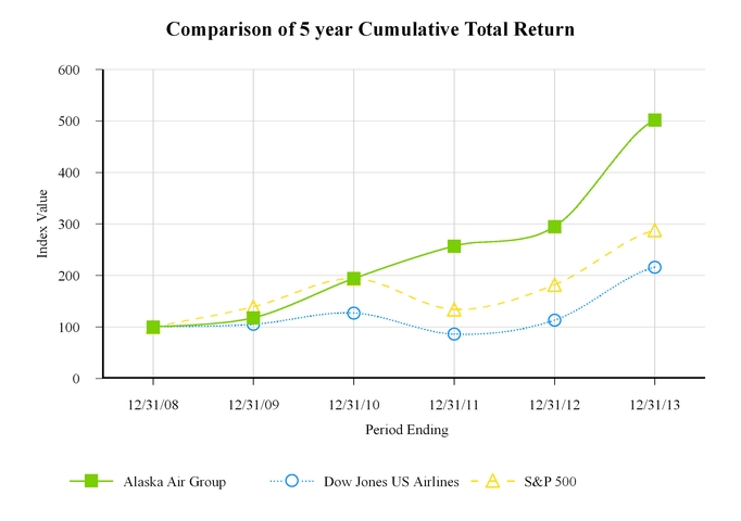 As of January 31, 2014, shares of common stock outstanding totaled 68,687,253. The aggregate market value of the shares of common stock of Alaska Air Group, Inc. held by nonaffiliates on June 30, 2013, was approximately $3.6 billion (based on the closing price of $51.70 per share on the New York Stock Exchange on that date).