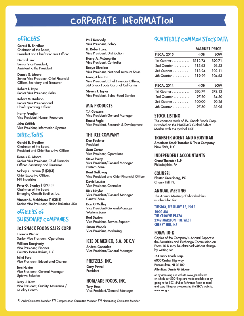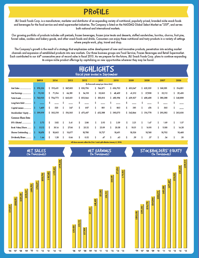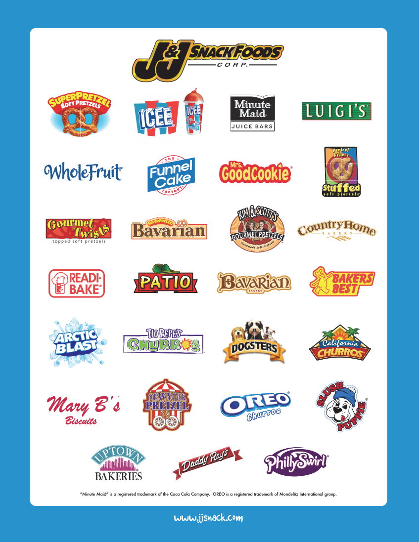 J & J Snack Foods Corp. (the “Company” or “J & J”) manufactures nutritional snack foods and distributes frozen beverages which it markets nationally to the food service and retail supermarket industries. The Company’s principal snack food products are soft pretzels marketed primarily under the brand names SUPERPRETZEL and BAVARIAN BAKERY, frozen juice treats and desserts marketed primarily under the LUIGI’S, WHOLE FRUIT, ICEE, PHILLY SWIRL and MINUTE MAID* brand names, churros marketed primarily under the TIO PEPE’S, CALIFORNIA CHURROS and OREO** brand names and bakery products sold primarily under the READI-BAKE, COUNTRY HOME, MARY B’S AND DADDY RAY’S brand names as well as for private label and contract packing. J & J believes it is the largest manufacturer of soft pretzels in the United States, Mexico and Canada. Other snack food products include funnel cake sold under THE FUNNEL CAKE FACTORY brand and dough enrobed handheld products sold under the PATIO brand and other smaller brands as well. The Company’s principal frozen beverage products are the ICEE brand frozen carbonated beverage and the SLUSH PUPPIE brand frozen non- carbonated beverage.