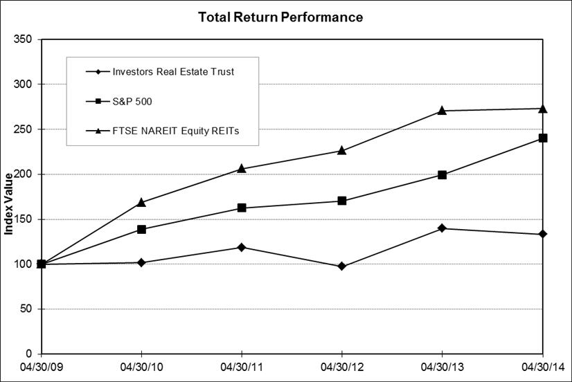 Investors Real Estate Trust ("IRET" or the "Company") is a self-advised equity Real Estate Investment Trust ("REIT") organized under the laws of North Dakota. Since our formation in 1970, our business has consisted of owning and operating income-producing real estate properties. We are structured as an Umbrella Partnership Real Estate Investment Trust or UPREIT and we conduct our day-to-day business operations through our operating partnership, IRET Properties, a North Dakota Limited Partnership ("IRET Properties" or the "Operating Partnership"). Our investments consist of multi-family residential properties and commercial office, commercial healthcare, commercial industrial and commercial retail properties. These properties are located primarily in the upper Midwest states of Minnesota and North Dakota. For the fiscal year ended April 30, 2014, our real estate investments in these two states accounted for 69.1% of our total gross revenue. Our principal executive office is located in Minot, North Dakota. We also have corporate offices in Minneapolis and St. Cloud, Minnesota, and additional property management offices in Kansas, Minnesota, Missouri, Montana, Nebraska, North Dakota and South Dakota.