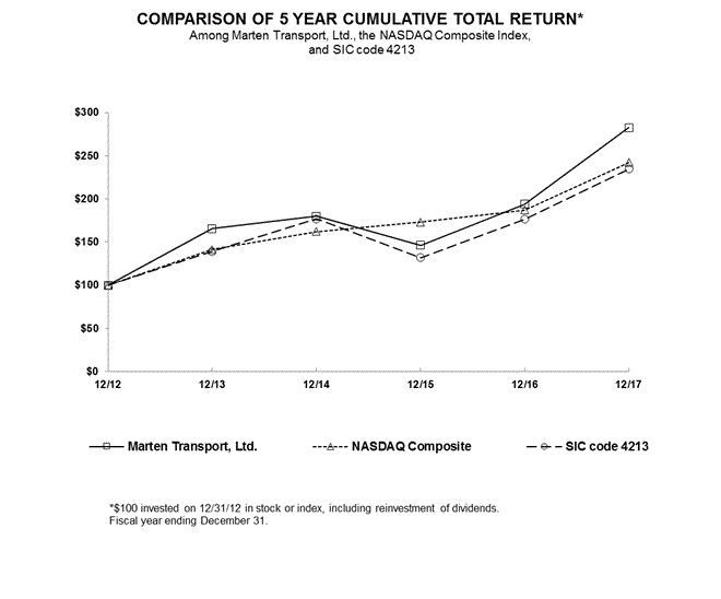101 The following financial information from Marten Transport, Ltd.’s Annual Report on Form 10-K for the period ended December 31, 2017, filed with the SEC on March 9, 2018, formatted in eXtensible Business Reporting Language (XBRL): (i) Consolidated Balance Sheets as of December 31, 2017 and December 31, 2016, (ii) Consolidated Statements of Operations for the three years ended December 31, 2017, (iii) Consolidated Statements of Stockholders’ Equity for the three years ended December 31, 2017, (iv) Consolidated Statements of Cash Flows for the three years ended December 31, 2017, and (v) Notes to Consolidated Financial Statements.   Filed with this Report.