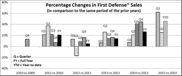 Reliance on sales of First Defense®: We are heavily reliant on the market acceptance of First Defense® to generate product sales and fund our operations. Our business would not have been profitable during the nine consecutive years in the period ended December 31, 2007, or during the years ended December 31, 2012 and 2013, or during the twelve-month, six-month and three-month periods ended June 30, 2015, without the gross margin that we earned on sales of First Defense®.