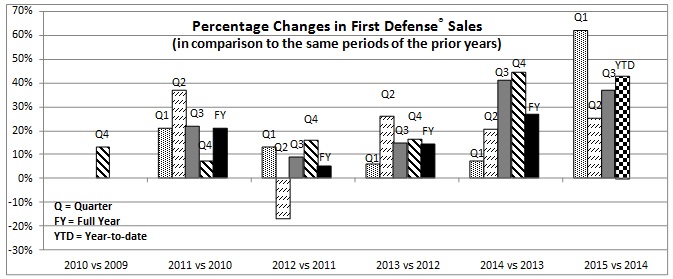 Reliance on sales of First Defense®: We are heavily reliant on the market acceptance of First Defense® to generate product sales and fund our operations. Our business would not have been profitable during the nine consecutive years in the period ended December 31, 2007, or during the years ended December 31, 2012 and 2013, or during the twelve-month, nine-month and three-month periods ended September 30, 2015, without the gross margin that we earned on sales of First Defense®, which accounted for over 87% of our product sales during the 2015 periods.