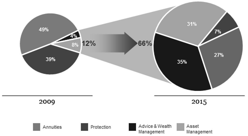 As a diversified financial services firm, we believe our ability to gather assets across the enterprise is best measured by our assets under management and administration metric. At December 31, 2015, we had $776.7 billion in assets under management and administration compared to $806.2 billion as of December 31, 2014. For a more detailed discussion of assets under management and administration see “Management’s Discussion and Analysis of Financial Condition and Results of Operations” included in Part II, Item 7 of this Annual Report on Form 10-K. The following chart shows our current business mix through the contributions of each segment to our pretax operating earnings (excluding Corporate & Other segment) as well as a historical comparison that reflects how we have executed on our strategy to shift our business mix toward higher growth areas in Advice & Wealth Management and Asset Management.