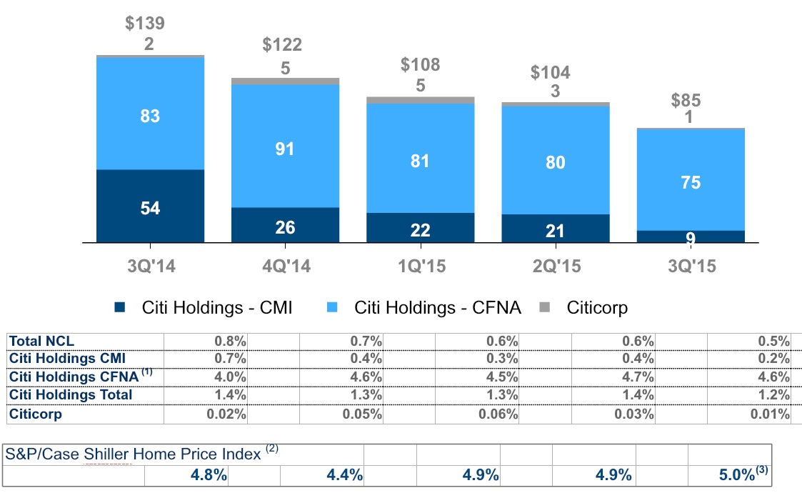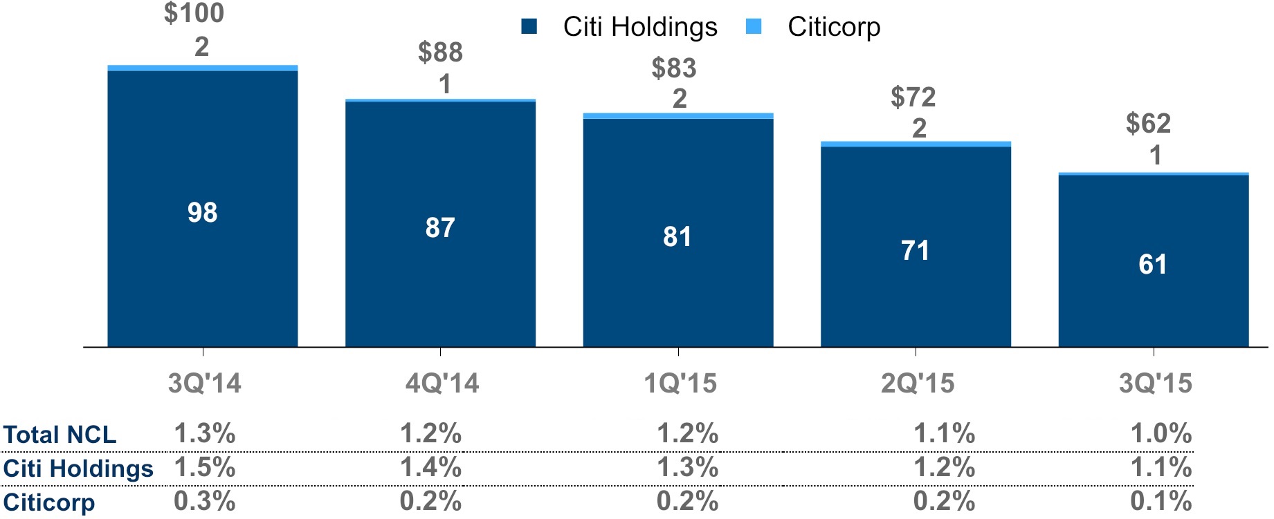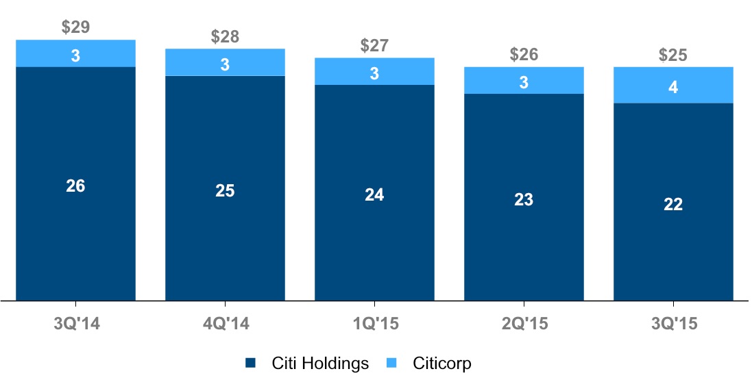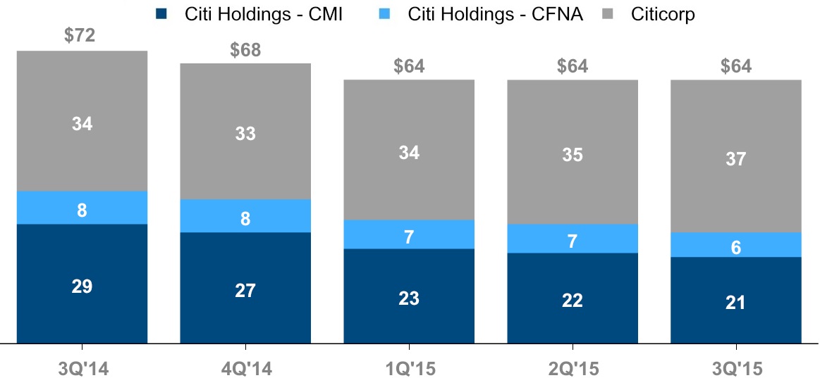 Continued wind down of Citi Holdings, while maintaining profitability: Citi continued to wind down Citi Holdings, including reducing its assets by $27 billion, or 20%, from the prior-year period. In addition, as of September 30, 2015, Citi had executed agreements to sell approximately $37 billion of additional assets in Citi Holdings, including OneMain Financial (for additional information, see “Citi Holdings” below). As discussed further below, Citi Holdings also maintained profitability in the third quarter of 2015.
