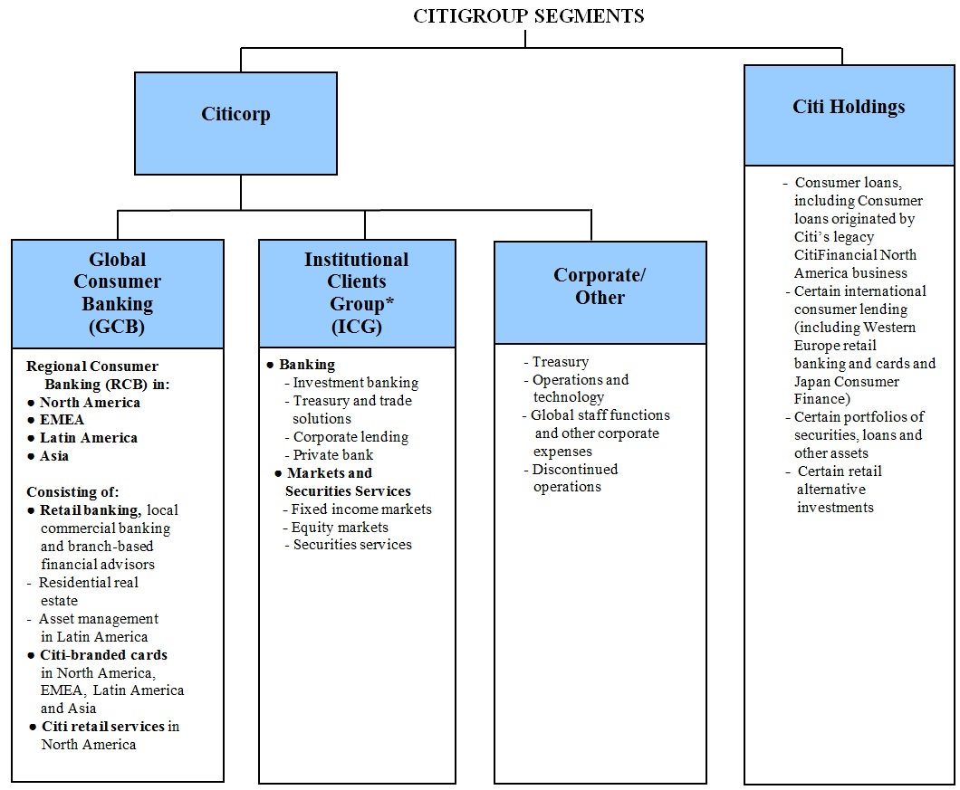 Citigroup currently operates, for management reporting purposes, via two primary business segments: Citicorp, consisting of Citi’s Global Consumer Banking businesses and Institutional Clients Group; and Citi Holdings, consisting of businesses and portfolios of assets that Citigroup has determined are not central to its core Citicorp businesses. For a further description of the business segments and the products and services they provide, see “Citigroup Segments” below, “Management’s Discussion and Analysis of Financial Condition and Results of Operations” and Note 3 to the Consolidated Financial Statements.