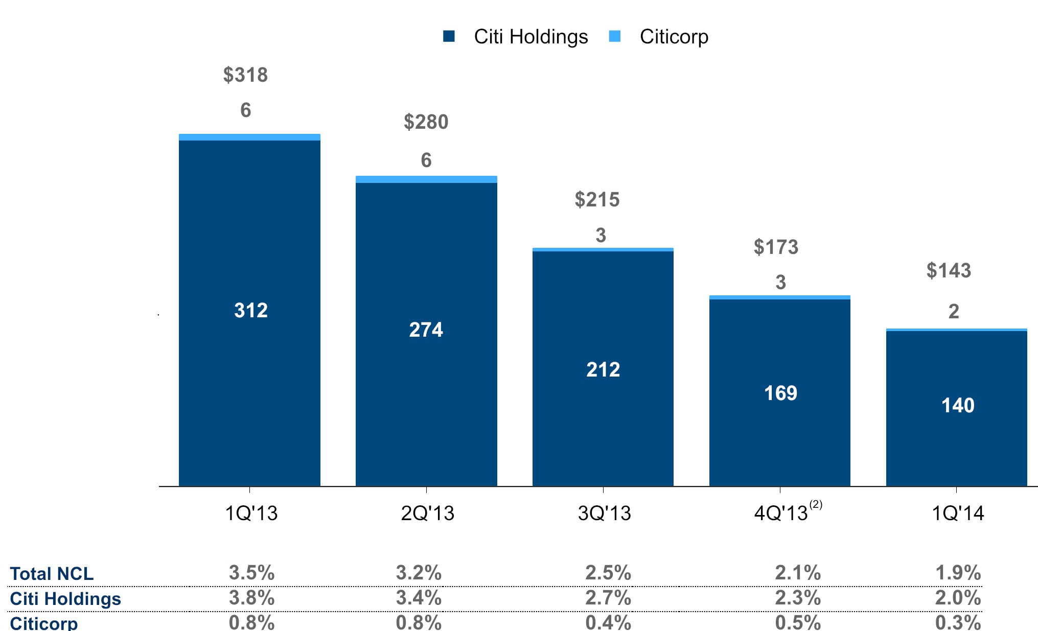 Continued focus on the wind down of Citi Holdings and getting Citi Holdings closer to “break even”: Citi Holdings’ assets declined by $35 billion, or 23%, from the prior-year period, and the net loss was reduced by approximately 65%. Citi also was able to resolve certain legacy legal issues relating to private-label securitization representation and warranty repurchase claims (see discussion below).