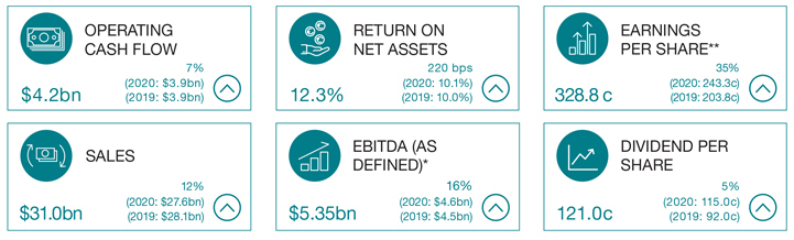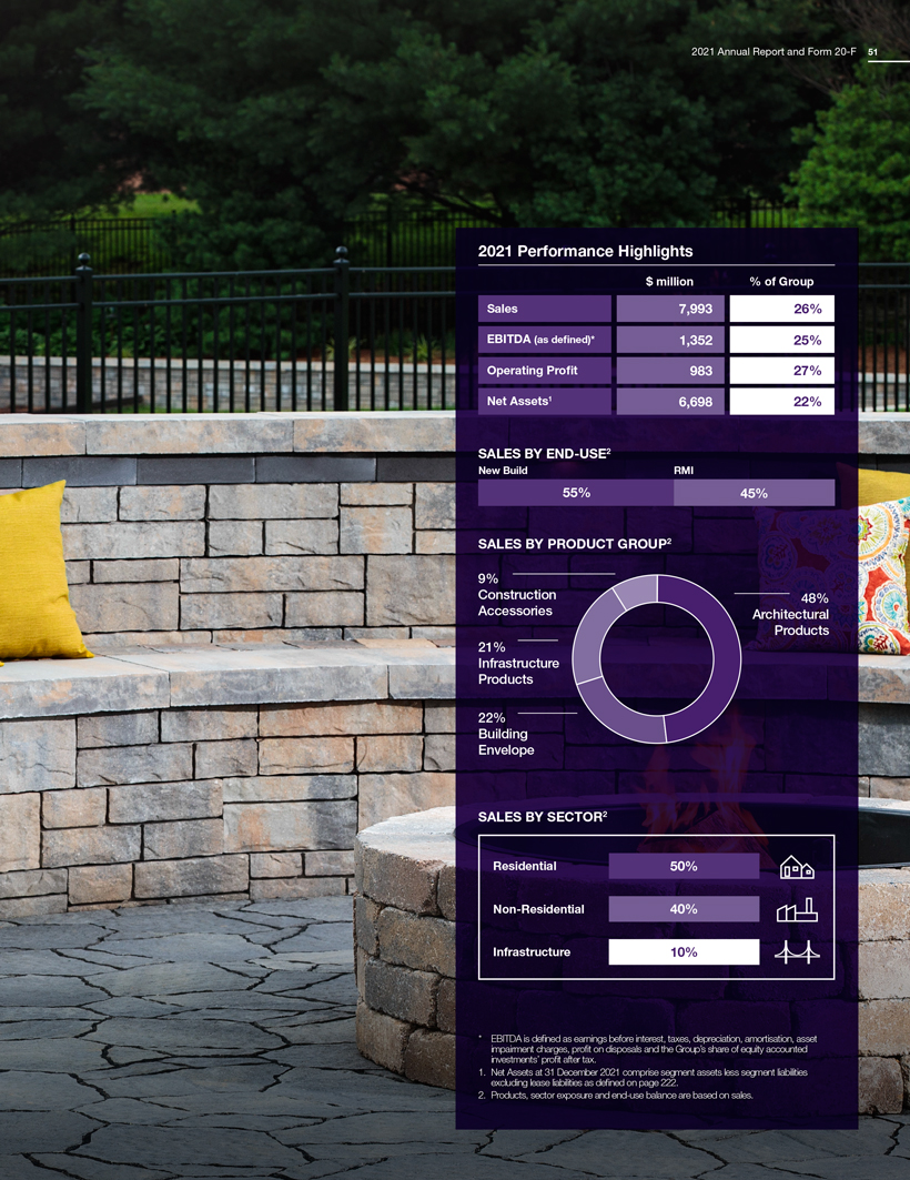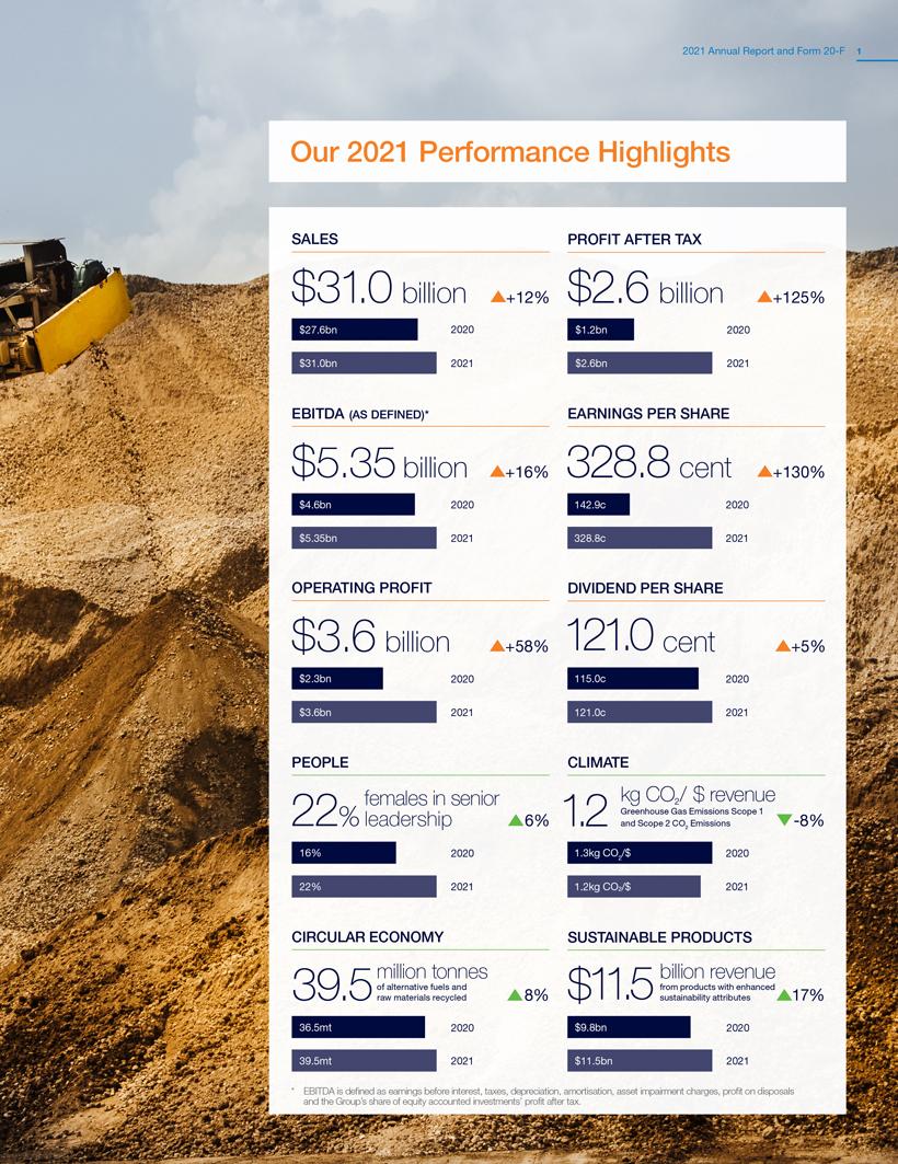 2021 Annual Report and Form 20-F 1 Our 2021 Performance Highlights SALES $31.0 billion +12% $27.6bn 2020 $31.0bn 2021 EBITDA (AS DEFINED)* $5.35 billion +16% $4.6bn 2020 $5.35bn 2021 OPERATING PROFIT $3.6 billion +58% $2.3bn 2020 $3.6bn 2021 PEOPLE 22%females in senior leadership 6% 16% 2020 22% 2021 CIRCULAR ECONOMY million tonnes of alternative fuels and 39.5raw materials recycled 8% 36.5mt 2020 39.5mt 2021 PROFIT AFTER TAX $2.6 billion +125% $1.2bn 2020 $2.6bn 2021 EARNINGS PER SHARE 328.8 cent +130% 142.9c 2020 328.8c 2021 DIVIDEND PER SHARE 121.0 cent +5% 115.0c 2020 121.0c 2021 CLIMATE kg CO2/ $ revenue Greenhouse Gas Emissions Scope 1 1.2 and Scope 2 CO Emissions -8% 2 1.3kg CO /$ 2020 2 1.2kg CO2/$ 2021 SUSTAINABLE PRODUCTS billion revenue $11.5from products with enhanced sustainability attributes 17% $9.8bn 2020 $11.5bn 2021 EBITDA is defined as earnings before interest, taxes, depreciation, amortisation, asset impairment charges, profit on disposals and the Group’s share of equity accounted investments’ profit after tax.
