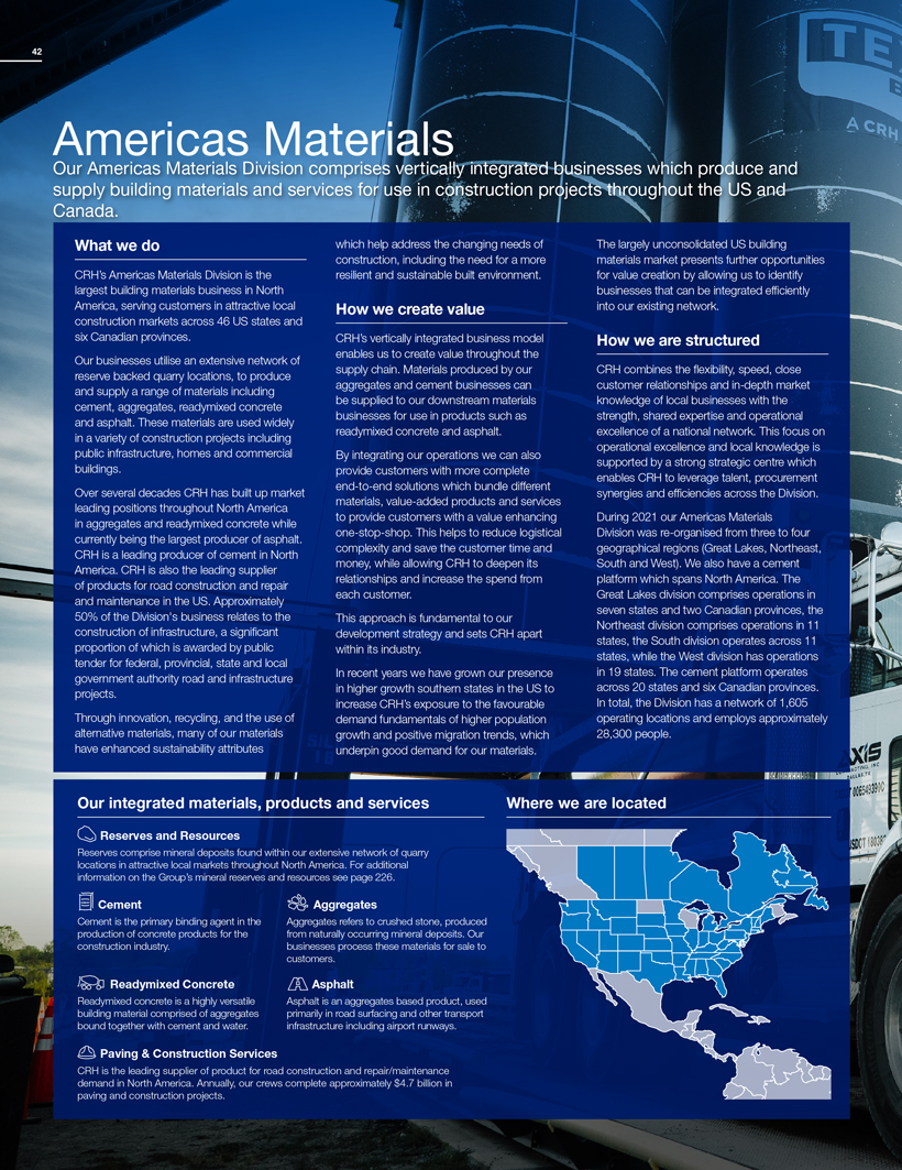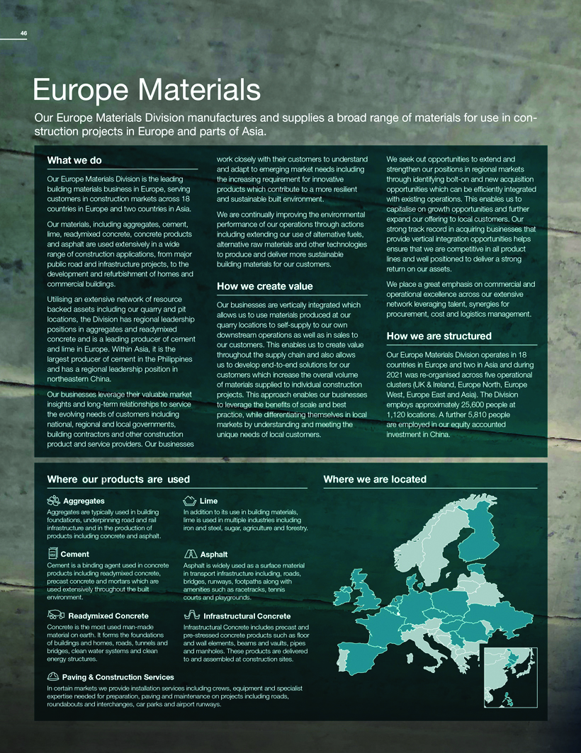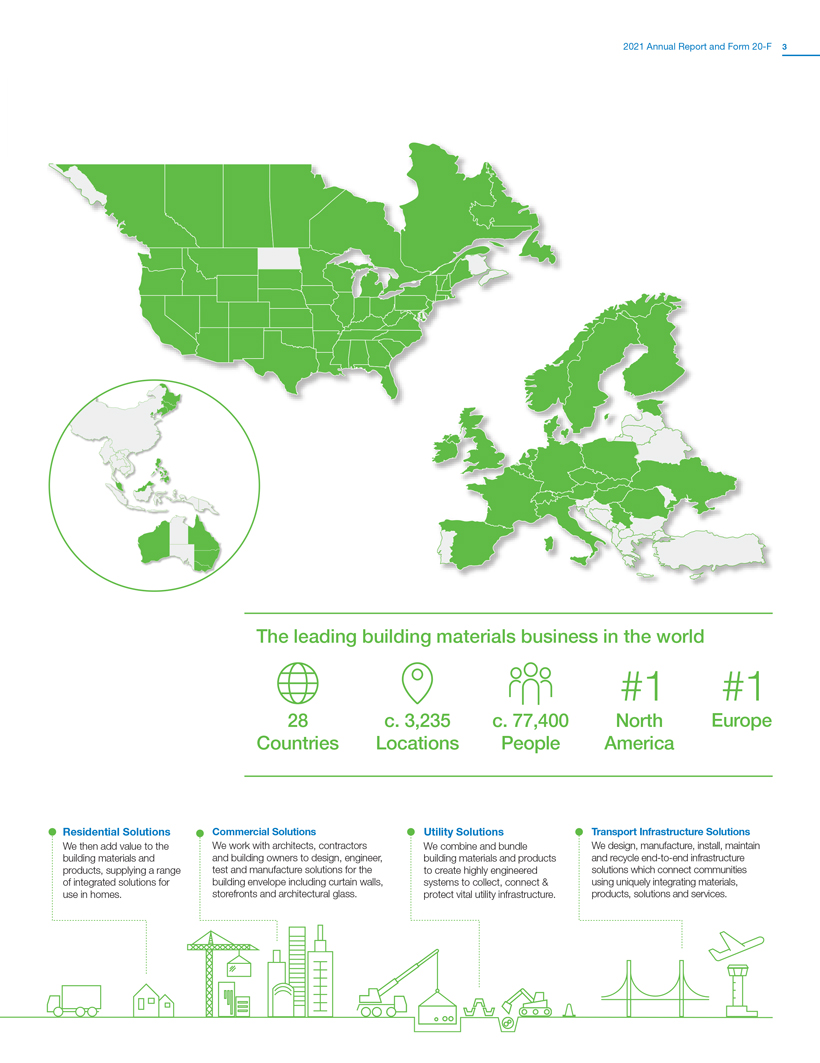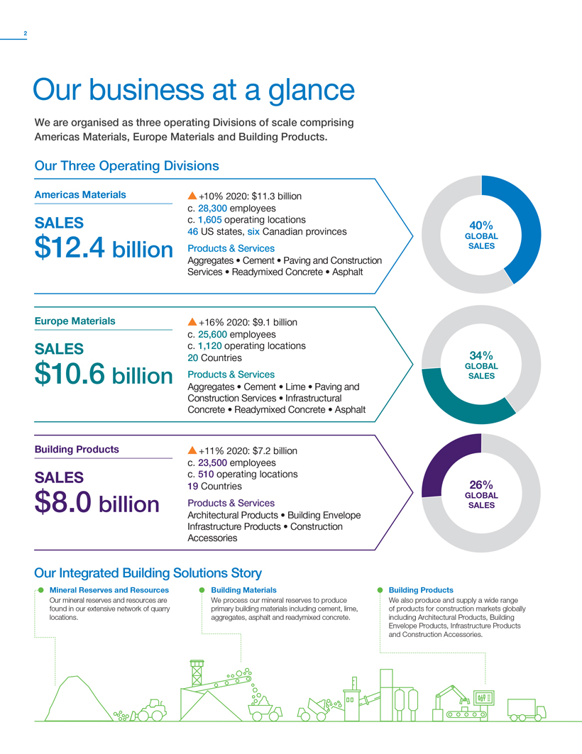 Our business at a glance We are organised as three operating Divisions of scale comprising Americas Materials, Europe Materials and Building Products. Our Three Operating Divisions Americas Materials +10% 2020: $11.3 billion c. 28,300 employees SALES c. 1,605 operating locations 46 US states, six Canadian provinces $12.4 billion Products & Services Aggregates • Cement • Paving and Construction Services • Readymixed Concrete • Asphalt Europe Materials +16% 2020: $9.1 billion c. 25,600 employees SALES c. 1,120 operating locations 20 Countries $10.6 billion Products & Services Aggregates • Cement • Lime • Paving and Construction Services • Infrastructural Concrete • Readymixed Concrete • Asphalt Building Products +11% 2020: $7.2 billion c. 23,500 employees SALES c. 510 operating locations 19 Countries $8.0 billion Products & Services Architectural Products • Building Envelope Infrastructure Products • Construction Accessories Our Integrated Building Solutions Story Mineral Reserves and Resources Our mineral reserves and resources are found in our extensive network of quarry locations. Building Materials We process our mineral reserves to produce primary building materials including cement, lime, aggregates, asphalt and readymixed concrete. Building Products We also produce and supply a wide range of products for construction markets globally including Architectural Products, Building Envelope Products, Infrastructure Products and Construction Accessories.