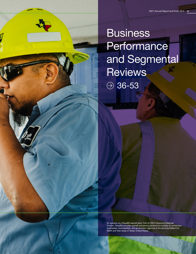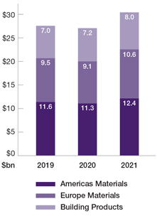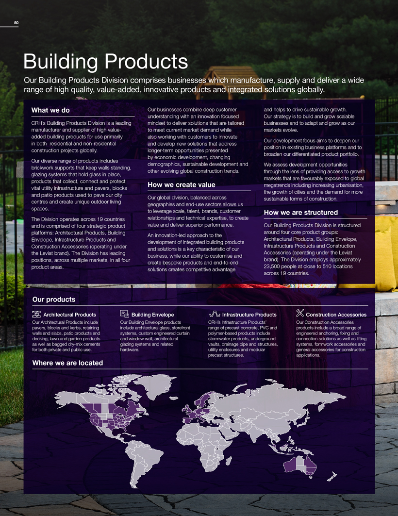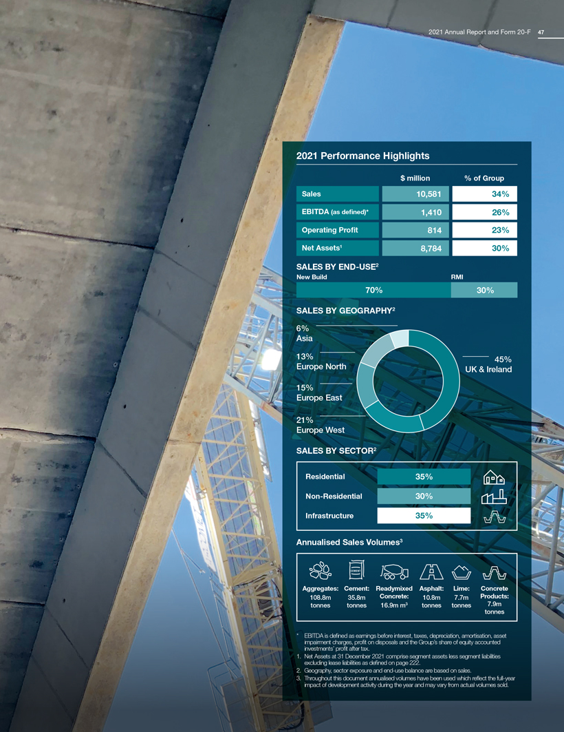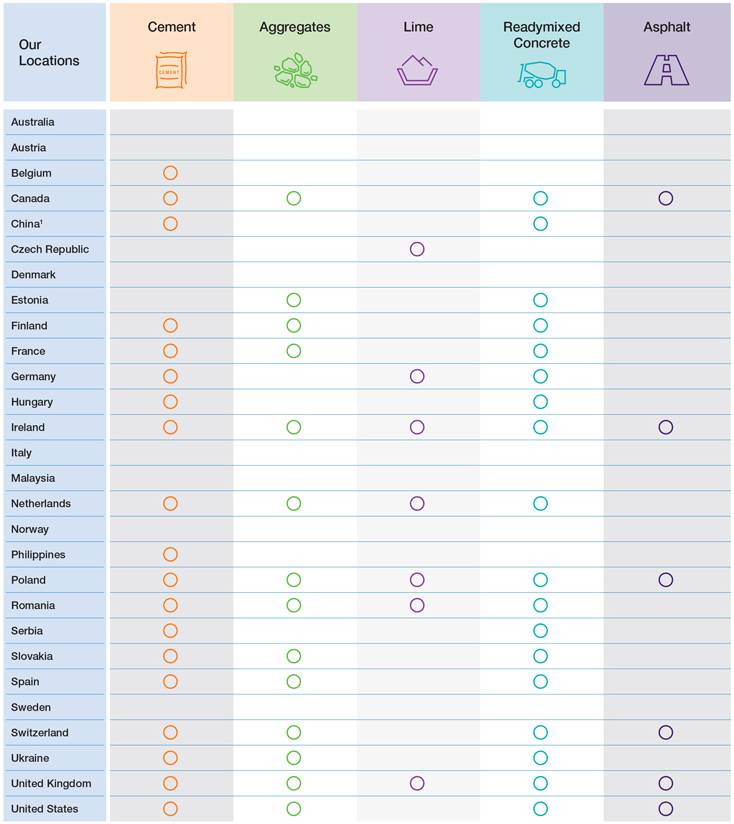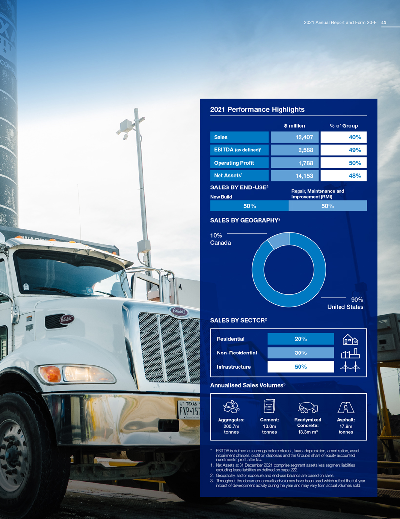 Our business at a glance We are organised as three operating Divisions of scale comprising Americas Materials, Europe Materials and Building Products. Our Three Operating Divisions Americas Materials +10% 2020: $11.3 billion c. 28,300 employees SALES c. 1,605 operating locations 46 US states, six Canadian provinces $12.4 billion Products & Services Aggregates • Cement • Paving and Construction Services • Readymixed Concrete • Asphalt Europe Materials +16% 2020: $9.1 billion c. 25,600 employees SALES c. 1,120 operating locations 20 Countries $10.6 billion Products & Services Aggregates • Cement • Lime • Paving and Construction Services • Infrastructural Concrete • Readymixed Concrete • Asphalt Building Products +11% 2020: $7.2 billion c. 23,500 employees SALES c. 510 operating locations 19 Countries $8.0 billion Products & Services Architectural Products • Building Envelope Infrastructure Products • Construction Accessories Our Integrated Building Solutions Story Mineral Reserves and Resources Our mineral reserves and resources are found in our extensive network of quarry locations. Building Materials We process our mineral reserves to produce primary building materials including cement, lime, aggregates, asphalt and readymixed concrete. Building Products We also produce and supply a wide range of products for construction markets globally including Architectural Products, Building Envelope Products, Infrastructure Products and Construction Accessories.