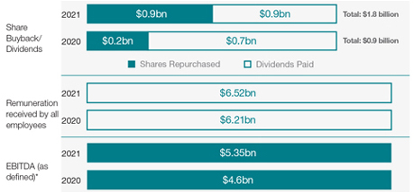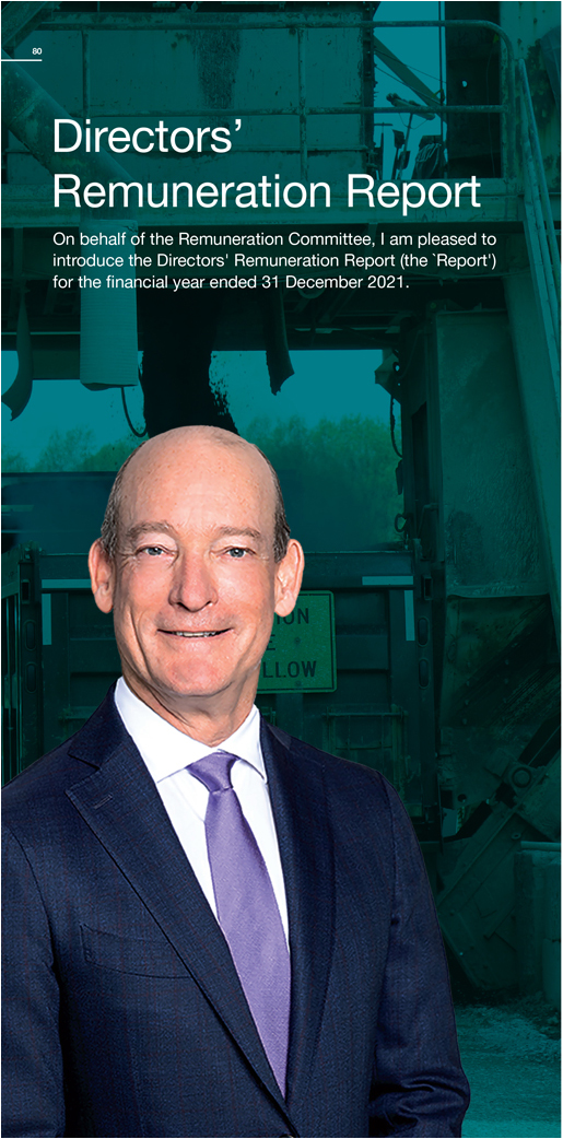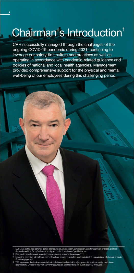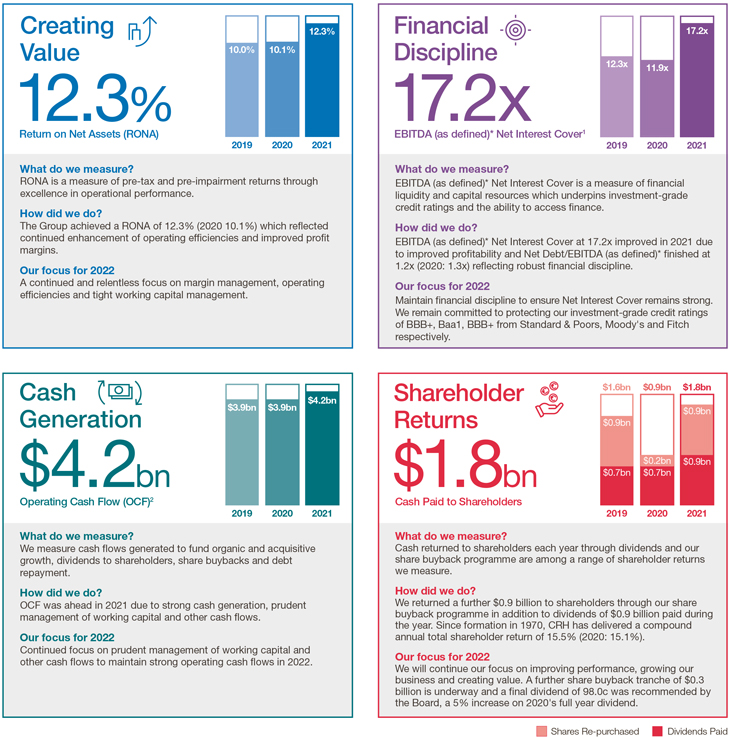 A Record Financial Performance 2021 saw a record financial performance for CRH, attributable to the hard work of our employees, the consistent execution of our clear, focused strategy, the resilience and flexibility of the Group’s business model and ongoing initiatives to enhance and improve business and operational performance. These results also reflect the value which customers place on the depth and breadth of CRH’s products and the expertise with which its skilled employees provide solutions for customers’ needs in a fast-evolving construction environment. CRH grew its revenues, profit, margins, cash generation and returns on capital during 2021 with Operating Cash Flow 2 of $4.2 billion (2020: $3.9 billion) arising from record EBITDA (as defined)* of $5.35 billion (2020: $4.6 billion), enabling, amongst other investment activities, capital expenditure of $1.6 billion (2020: $1.0 billion) in existing businesses. CRH continues to actively manage its portfolio of businesses, assessing the ability of each business to continue to contribute to CRH’s long-term strategy and evaluating the potential for acquisitions to enhance our business platforms through the provision of value-added solutions for customers. The strength of CRH’s business model, balance sheet and cash generation provide the Board with significant optionality to invest in businesses which fit our clearly defined strategy and which can generate enhanced value for our shareholders. During 2021, CRH invested $1.5 billion (2020: $0.4 billion) on acquisitions and we have a strong pipeline of development opportunities. Further details on the record performance in 2021 and implementation of CRH’s value creation strategy are set out in the Chief Executive’s report on pages 10 to 11. Delivering Cash Returns And Capital Dividends paid to CRH shareholders with respect to the 2020 financial year of 115.0c per share represented an increase of 25% compared to the total dividends per share declared for the 2019 financial year. In addition, during 2021 CRH continued its share buyback programme, investing $0.9 billion (2020: $0.2 billion). Reflecting your Board’s confidence in CRH and its future prospects, and our objective of continuing to have a sustainable, progressive dividend policy, the Board is recommending a final dividend of 98.0c for the 2021 financial year. This represents a total dividend of 121.0c per share for the 2021 financial year, an increase of 5% compared to 2020. Since 1970 CRH’s compound annual Total Shareholder Return (‘TSR’) 3 has been 15.5% (2020: 15.1%). At the 2022 Annual General Meeting, the Board will seek a renewal of the annual authority enabling the Board to continue with the share buyback programme. |