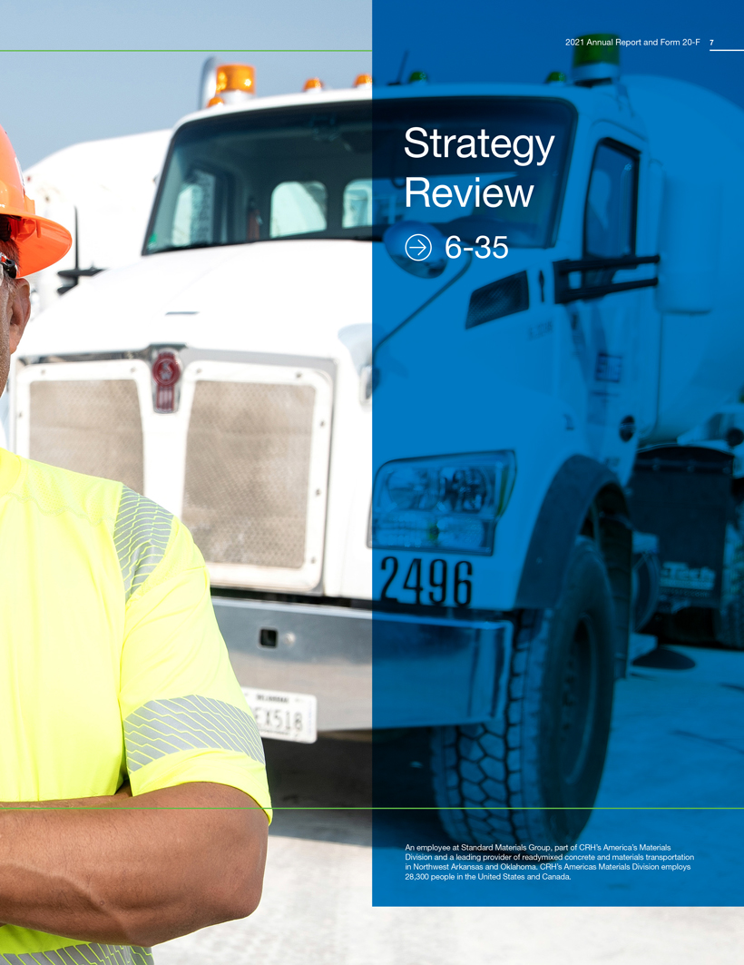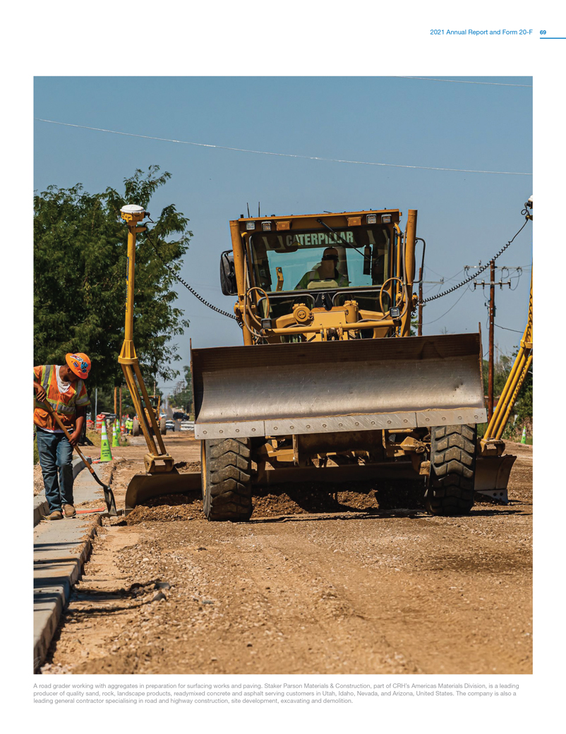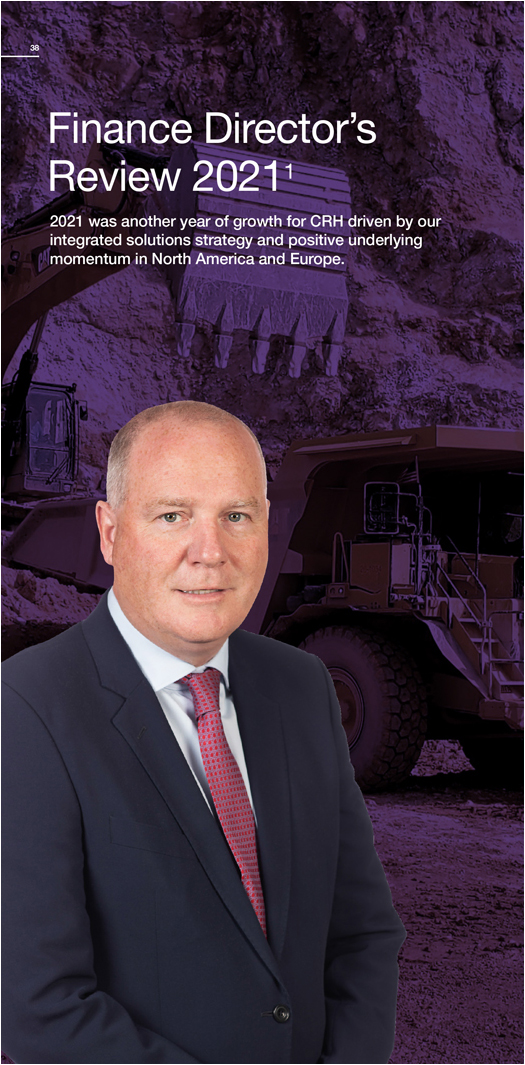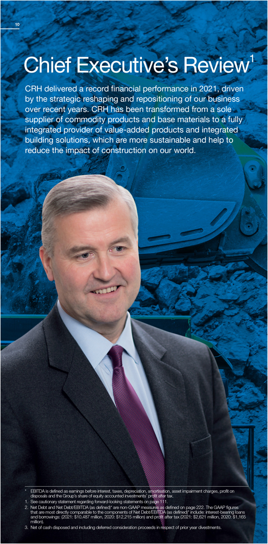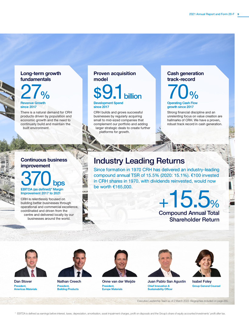 2021 Annual Report and Form 20-F 9 Long-term growth fundamentals 27% Revenue Growth since 2017 There is a natural demand for CRH products driven by population and economic growth and the need to continually build and maintain the built environment. Proven acquisition model $9.1billion Development Spend since 2017 CRH builds and grows successful businesses by regularly acquiring small to mid-sized companies that complement our portfolio and adding larger strategic deals to create further platforms for growth. Cash generation track-record 70% Operating Cash Flow growth since 2017 Strong financial discipline and an unrelenting focus on value creation are hallmarks of CRH. We have a proven, robust track record in cash generation. Continuous business improvement 370 bps EBITDA (as defined)* Margin Improvement 2017 to 2021 CRH is relentlessly focused on building better businesses through operational and commercial excellence, coordinated and driven from the centre and delivered locally by our businesses around the world. Industry Leading Returns Since formation in 1970 CRH has delivered an industry-leading compound annual TSR of 15.5% (2020: 15.1%). €100 invested in CRH shares in 1970, with dividends reinvested, would now be worth €165,000. +15. Compound Annual Total Shareholder Return Dan Stover President, Americas Materials Nathan Creech President, Building Products Onne van der Weijde President, Europe Materials Juan Pablo San Agustin Chief Innovation & Sustainability Officer Isabel Foley Group General Counsel Executive Leadership Team as of 2 March 2022. Biographies included on page 265. * EBITDA is defined as earnings before interest, taxes, depreciation, amortisation, asset impairment charges, profit on disposals and the Group’s share of equity accounted investments’ profit after tax.