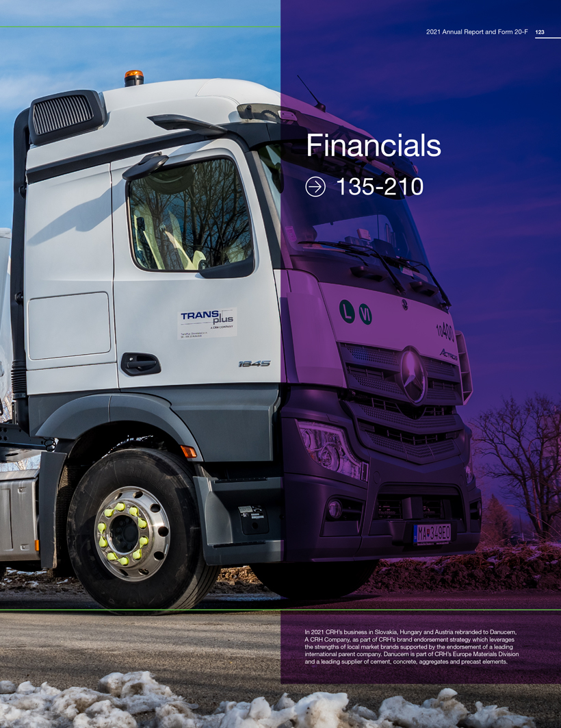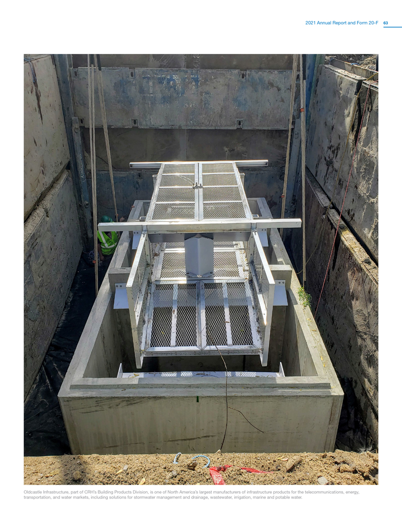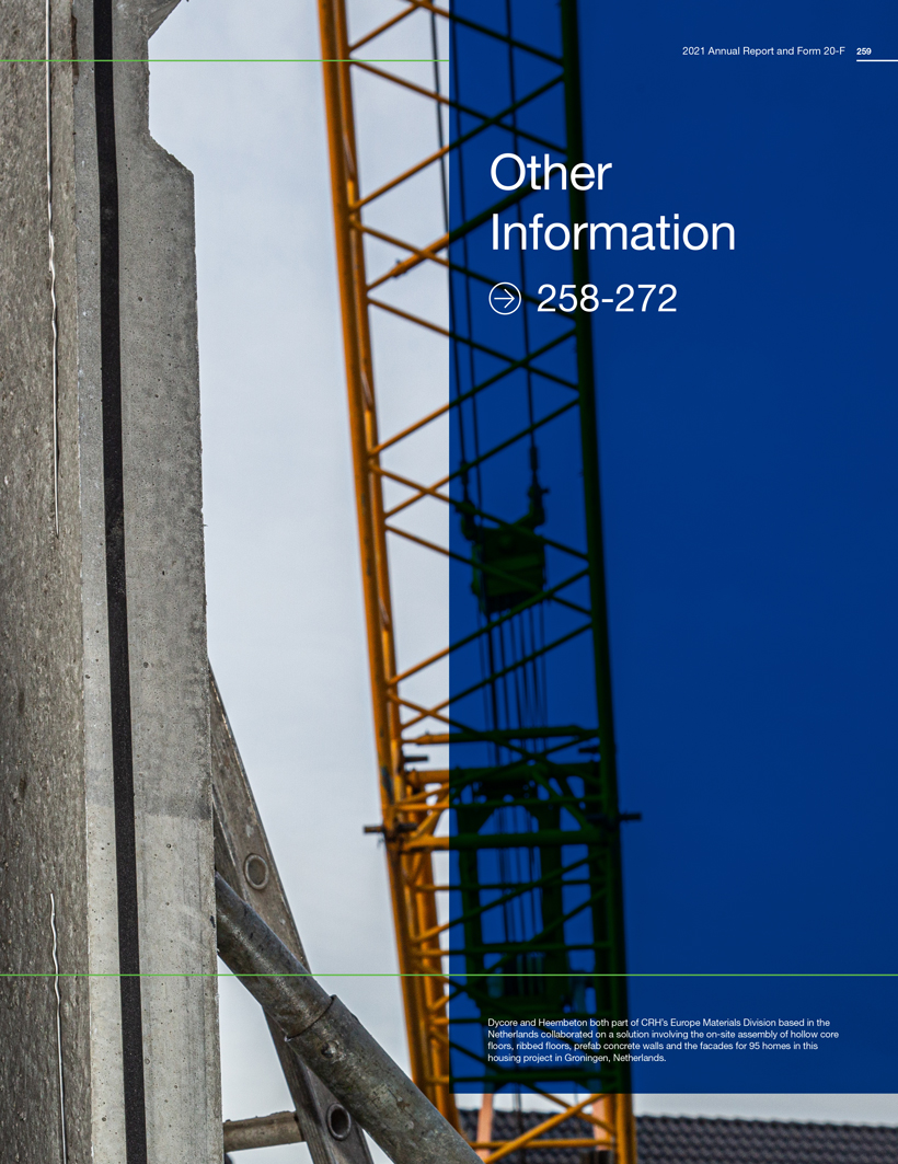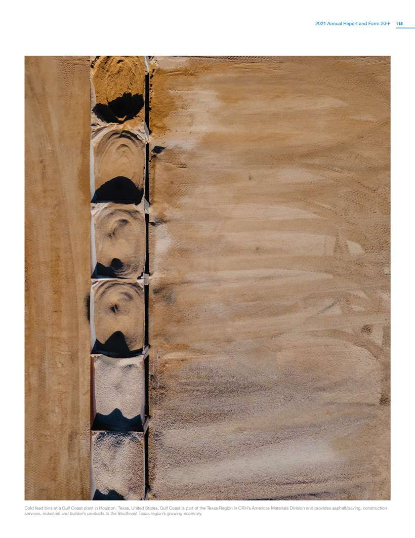 2021 Annual Report and Form 20-F 9 Long-term growth fundamentals 27% Revenue Growth since 2017 There is a natural demand for CRH products driven by population and economic growth and the need to continually build and maintain the built environment. Proven acquisition model $9.1billion Development Spend since 2017 CRH builds and grows successful businesses by regularly acquiring small to mid-sized companies that complement our portfolio and adding larger strategic deals to create further platforms for growth. Cash generation track-record 70% Operating Cash Flow growth since 2017 Strong financial discipline and an unrelenting focus on value creation are hallmarks of CRH. We have a proven, robust track record in cash generation. Continuous business improvement 370 bps EBITDA (as defined)* Margin Improvement 2017 to 2021 CRH is relentlessly focused on building better businesses through operational and commercial excellence, coordinated and driven from the centre and delivered locally by our businesses around the world. Industry Leading Returns Since formation in 1970 CRH has delivered an industry-leading compound annual TSR of 15.5% (2020: 15.1%). €100 invested in CRH shares in 1970, with dividends reinvested, would now be worth €165,000. +15. Compound Annual Total Shareholder Return Dan Stover President, Americas Materials Nathan Creech President, Building Products Onne van der Weijde President, Europe Materials Juan Pablo San Agustin Chief Innovation & Sustainability Officer Isabel Foley Group General Counsel Executive Leadership Team as of 2 March 2022. Biographies included on page 265. * EBITDA is defined as earnings before interest, taxes, depreciation, amortisation, asset impairment charges, profit on disposals and the Group’s share of equity accounted investments’ profit after tax.