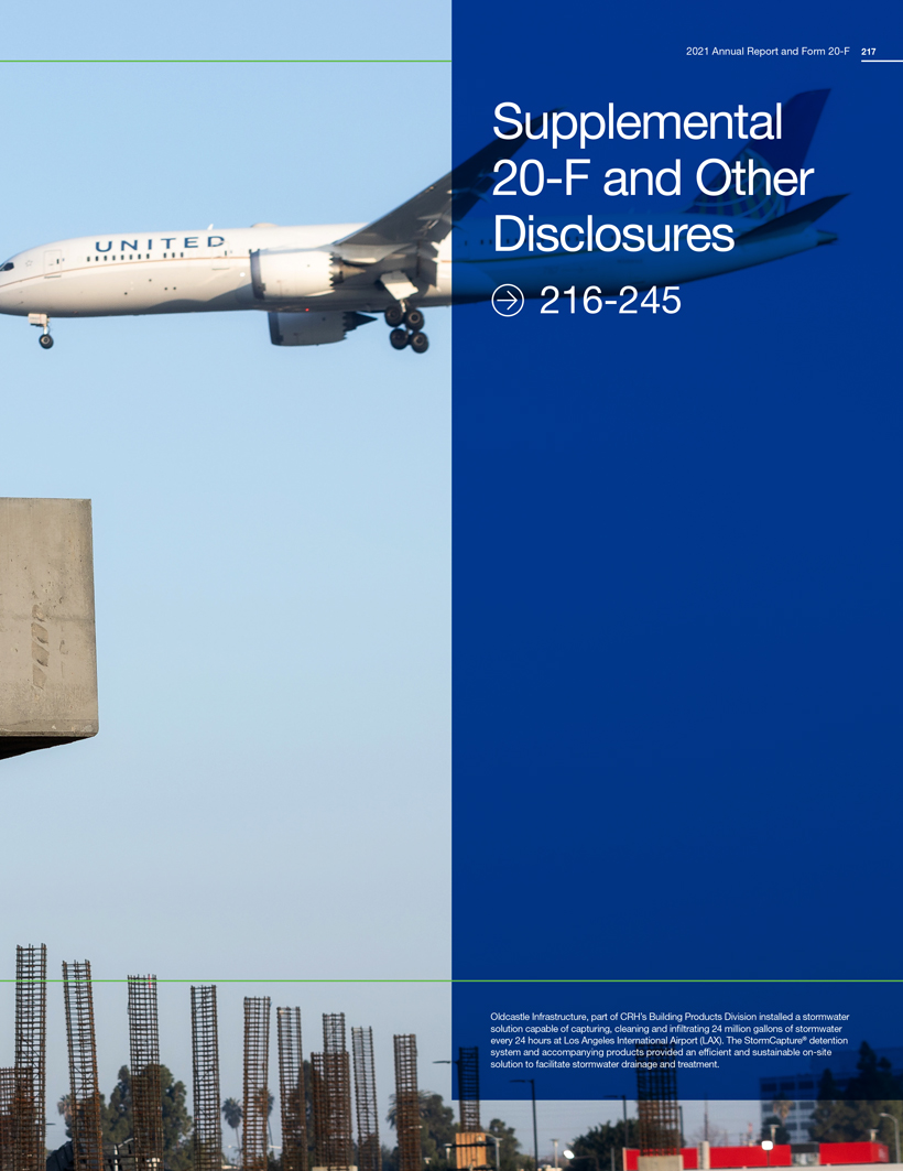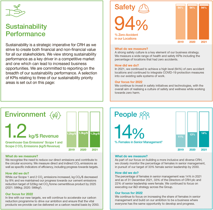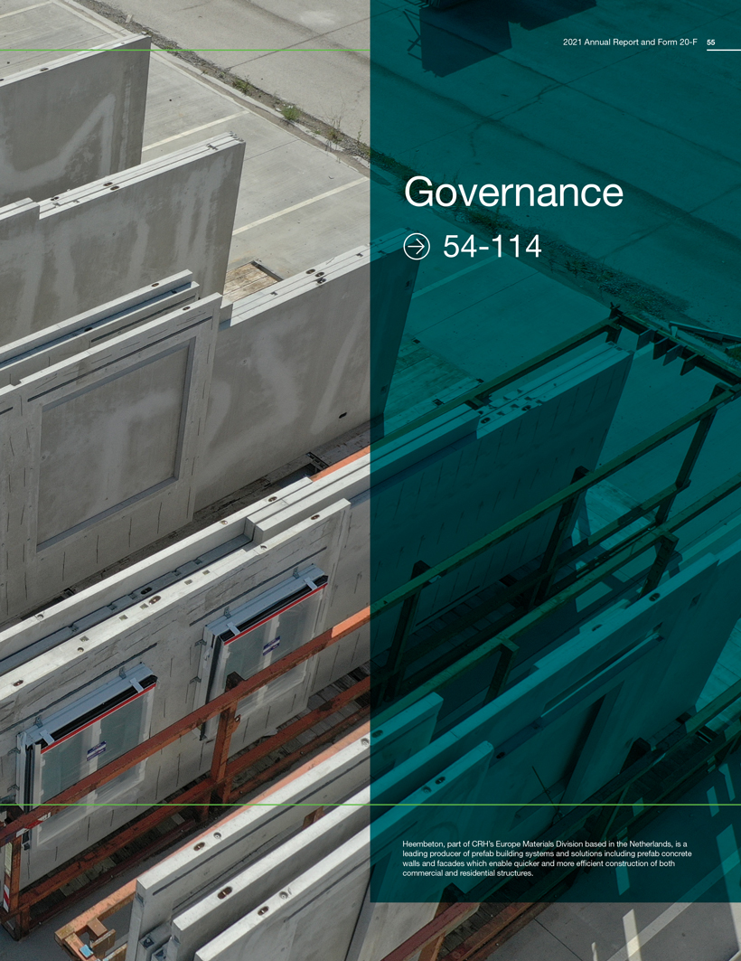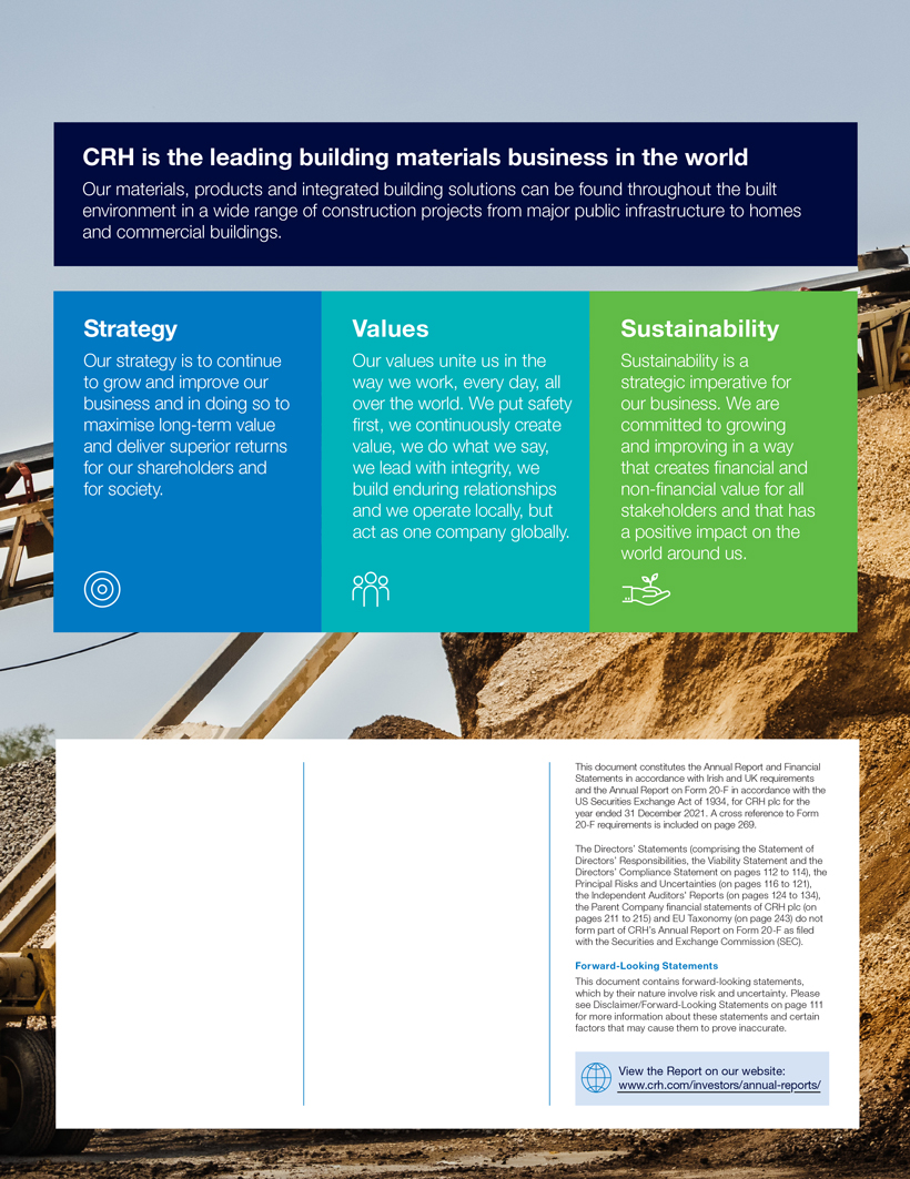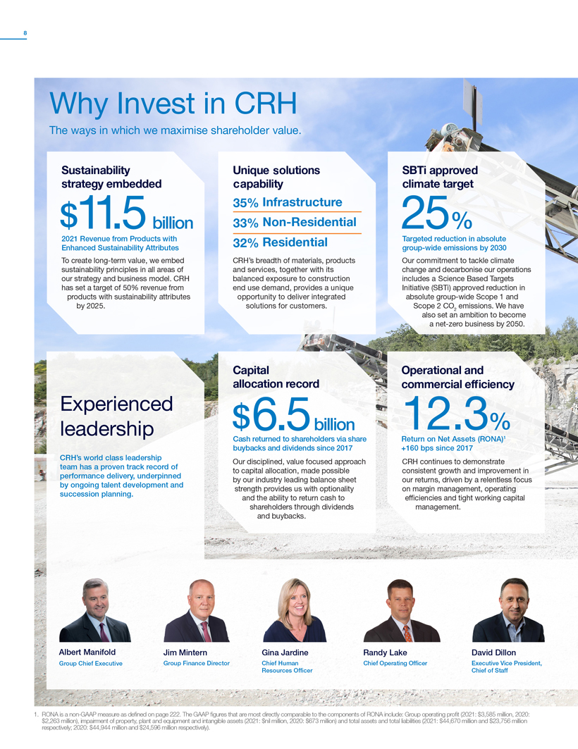 Why Invest in CRH The ways in which we maximise shareholder value. Sustainability strategy embedded $11.5 billion 2021 Revenue from Products with Enhanced Sustainability Attributes To create long-term value, we embed sustainability principles in all areas of our strategy and business model. CRH has set a target of 50% revenue from products with sustainability attributes by 2025. Unique Solutions Capability 35% Infrastructure 33% Non-Residential 32% Residential CRH’s breadth of materials, products and services, together with its balanced exposure to construction end use demand, provides a unique opportunity to deliver integrated solutions for customers. SBTi approved climate target 25% Targeted reduction in absolute group-wide emissions by 2030 Our commitment to tackle climate change and decarbonise our operations includes an Science Based Targets Initiative (SBTi) approved reduction in absolute group-wide Scope 1 and Scope 2 CO emissions. We have 2 also set an ambition to become a net-zero business by 2050. Experienced leadership CRH’s world class leadership team has a proven track record of performance delivery, underpinned by ongoing talent development and succession planning. Capital allocation record $6.5 billion Cash returned to shareholders via share buybacks and dividends since 2017 Our disciplined, value focused approach to capital allocation, made possible by our industry leading balance sheet strength provides us with optionality and the ability to return cash to shareholders through dividends and buybacks. Operational and commercial efficiency 12.3% Return on Net Assets (RONA)1 +160 bps since 2017 CRH continues to demonstrate consistent growth and improvement in our returns, driven by a relentless focus on margin management, operating efficiencies and tight working capital management. Albert Manifold Group Chief Executive Jim Mintern Group Finance Director Gina Jardine Chief Human Resources Officer Randy Lake Chief Operating Officer David Dillon Executive Vice President, Chief of Staff RONA is a non-GAAP measure as defined on page 222. The GAAP figures that are most directly comparable to the components of RONA include: Group operating profit (2021: $3,585 million, 2020: $2,263 million), impairment of property, plant and equipment and intangible assets (2021: $nil million, 2020: $673 million) and total assets and total liabilities (2021: $44,670 million and $23,756 million respectively; 2020: $44,944 million and $24,596 million respectively).