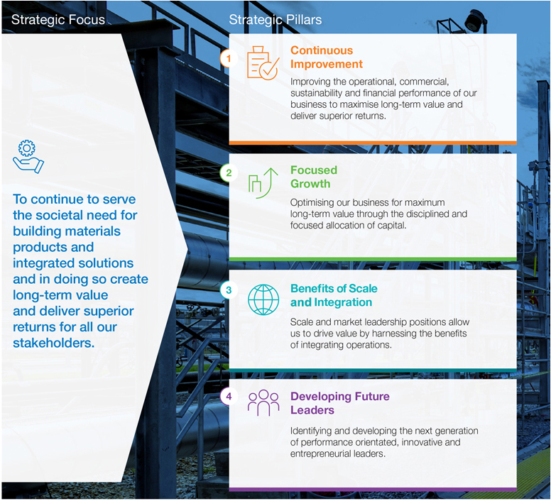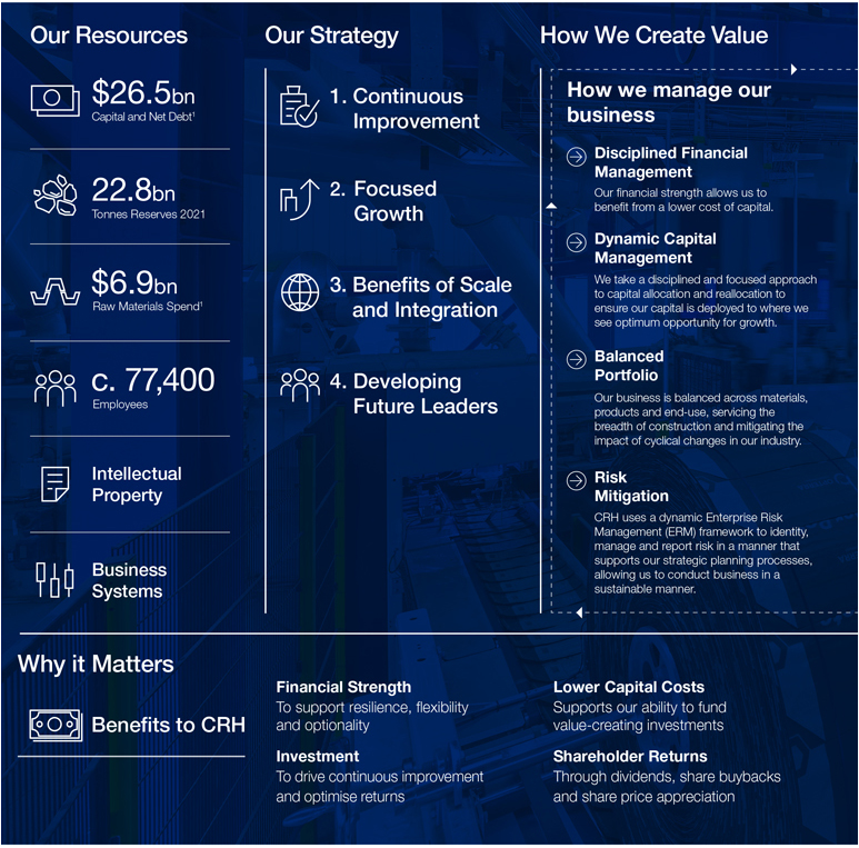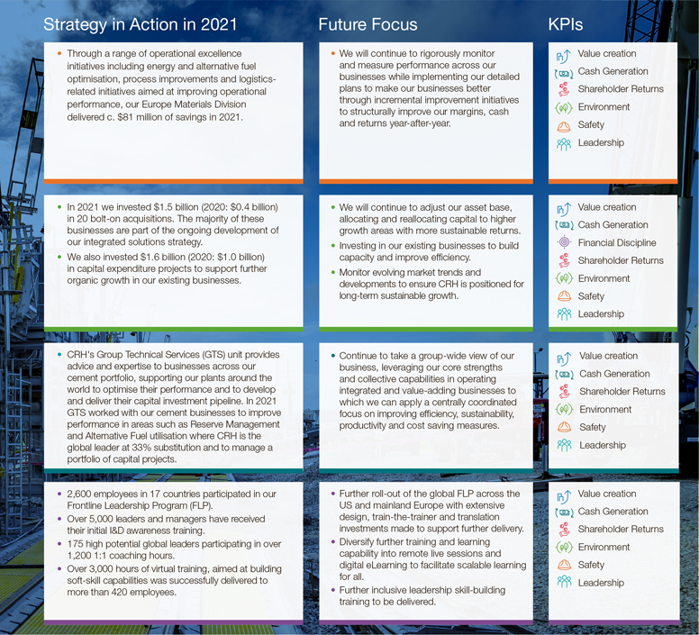 Continuing to ensure that CRH has the appropriate, clearly communicated and shareholder-endorsed strategy and business model and capital allocation policy to support continued success and value creation. |