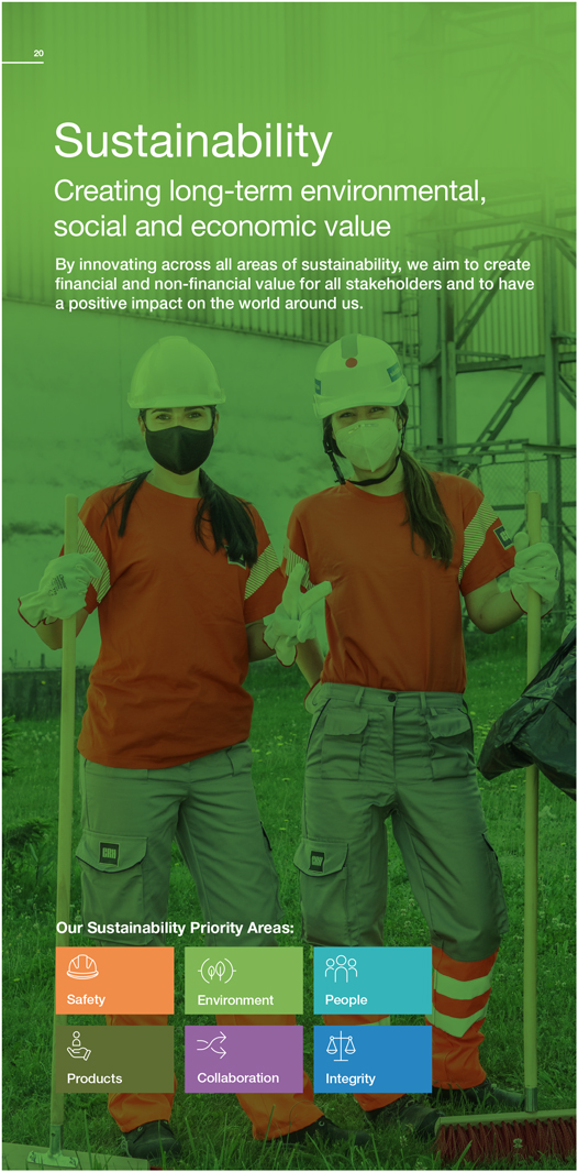 Our 2020 Sustainability Report set out challenging targets for mitigating our environmental impact, enhancing the contributions our products and customer-solutions make to the circular economy and sustainable economic growth, ensuring the safety of our people and progressing our inclusion and diversity (I&D) agenda.