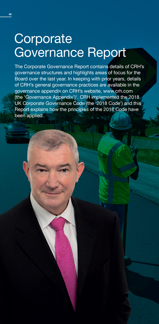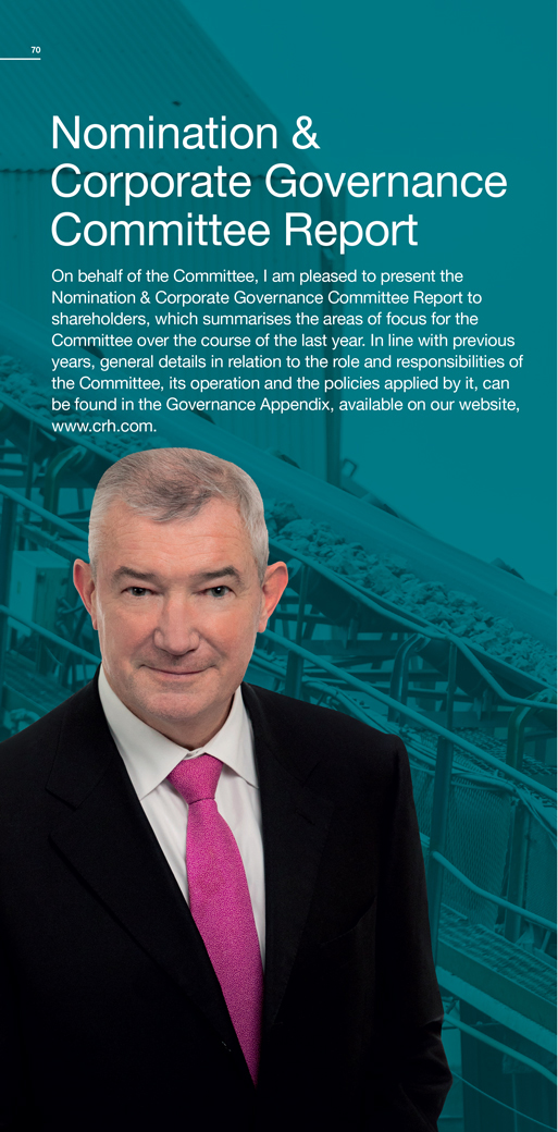 As is CRH’s policy and practice, Caroline, Badar and Jim will retire at the AGM and along with all other current members of the Board will stand for re-election by shareholders. The background and experience of each Board member, along with CRH’s policies and approach to ongoing Board assessment and renewal are covered in more detail in the Nomination and Governance Committee’s Report on pages 70 to 75.