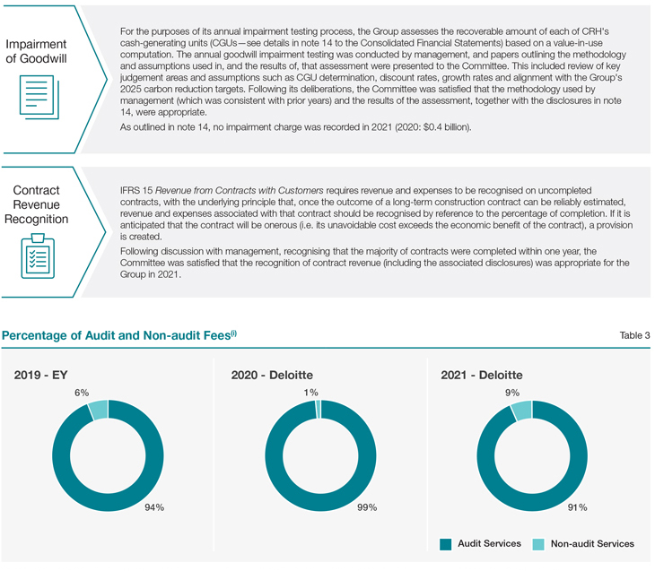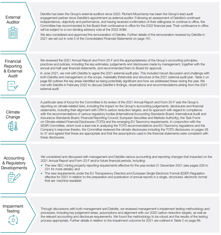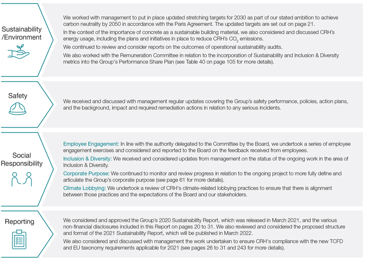 In relation to COVID-19, the Board regularly monitored CRH’s approach, initiatives and the outcomes therefrom against available research, best practice and the experiences of the wider populations where our businesses are located.