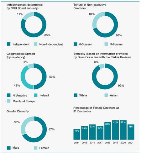 As Chairman I am pleased to report that your Board continues to operate very effectively and cohesively in the ongoing assessment of strategy and business performance, the purpose and culture of CRH and the quality and contributions of its people. This is due to the experience and attributes of individual Directors and the collective efforts of a diverse team of people. The performance of the Board was evaluated by an external evaluator in 2021. This process similarly concluded that the Board was performing very effectively.